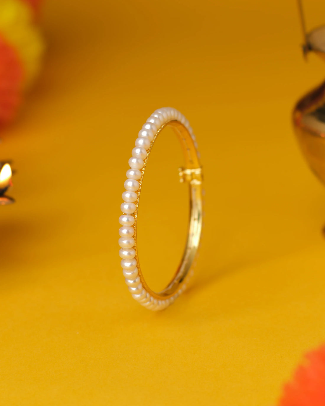 This sleek gold-plated bangle is adorned with a neat row of pearls, offering a timeless...