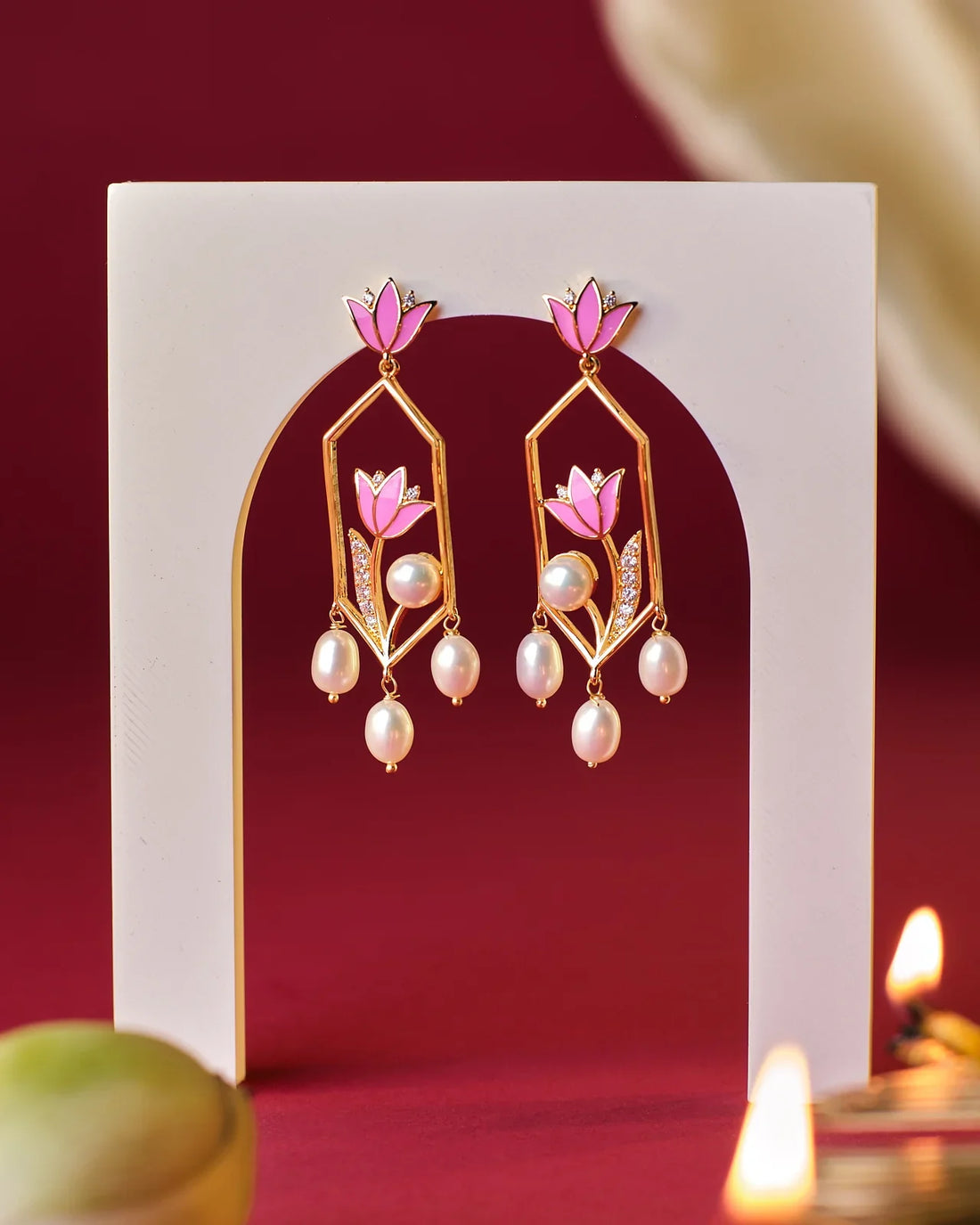 Floral Lotus-Inspired Earrings with Pearls & Enamel Work