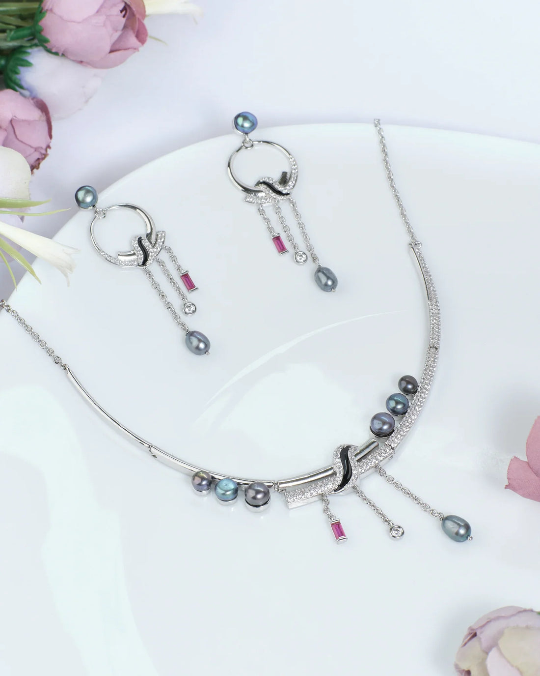 Cascading pearls and CZ stones deliver glamorous evening elegance necklace set
