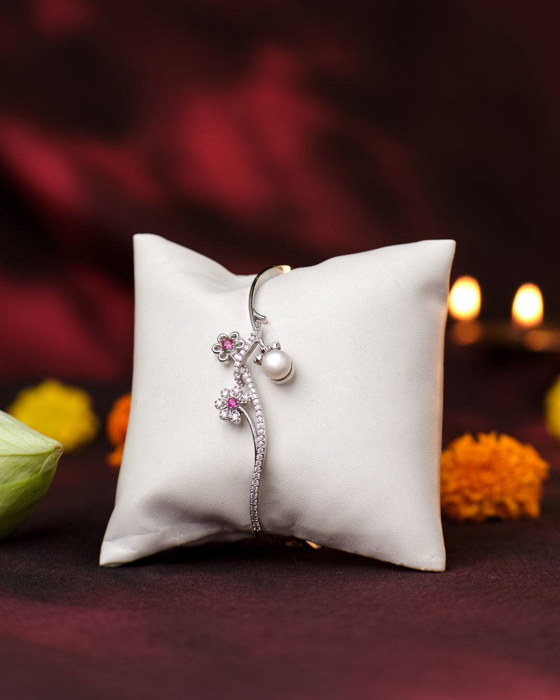 A nature-inspired design with sparkling flowers, pink gemstones, and a dangling pearl, this bangle radiates...