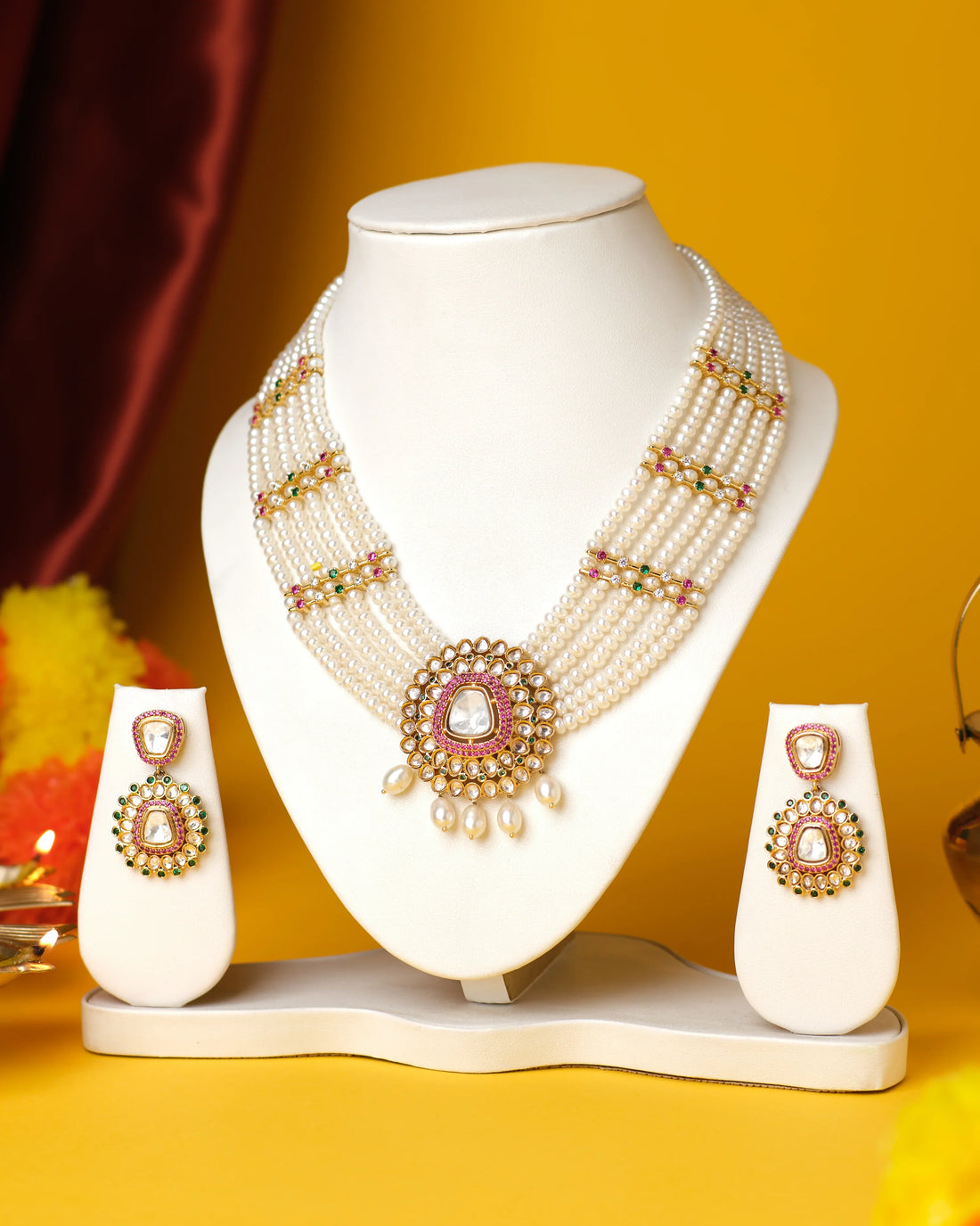 An opulent pearl necklace designed with rows of pearls and embedded kundan motifs bordered with...