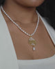 A graceful necklace set featuring classic white pearls paired with a gold-tone traditional motif pendant...