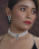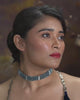 A striking choker crafted with layered rows of peacock-toned pearls and subtle spacer accents. Elegant...