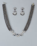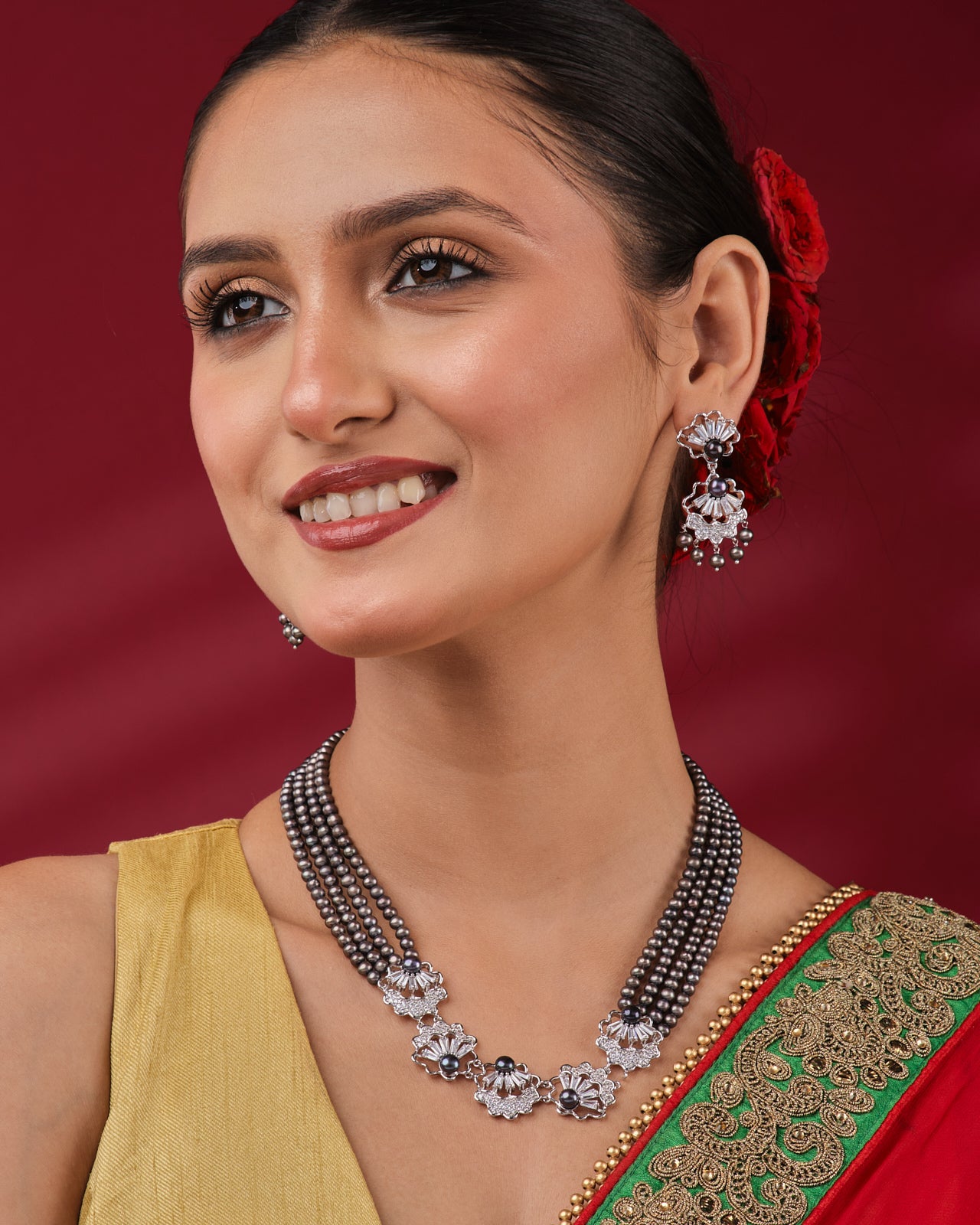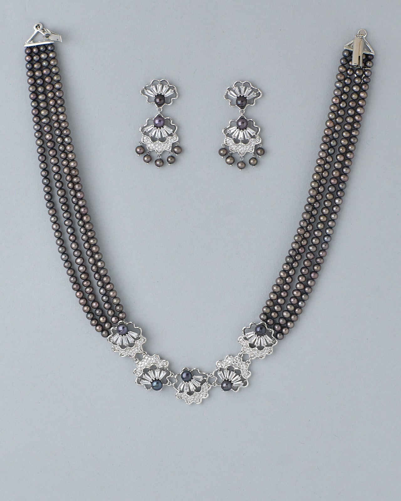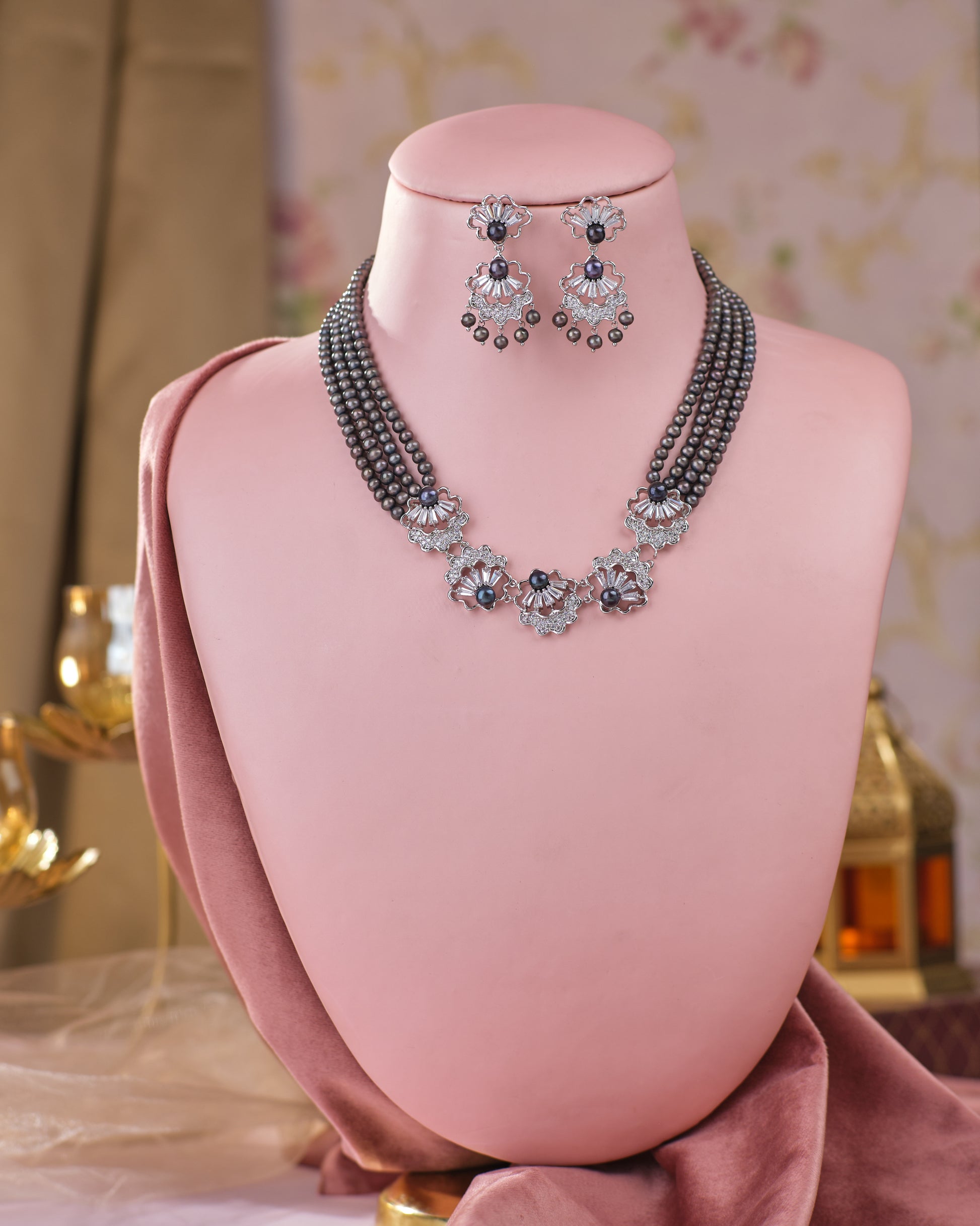 Featuring black pearls and CZ floral motifs, this intricately designed necklace exudes luxury and sophistication. The matching earrings complete the elegant bridal look.