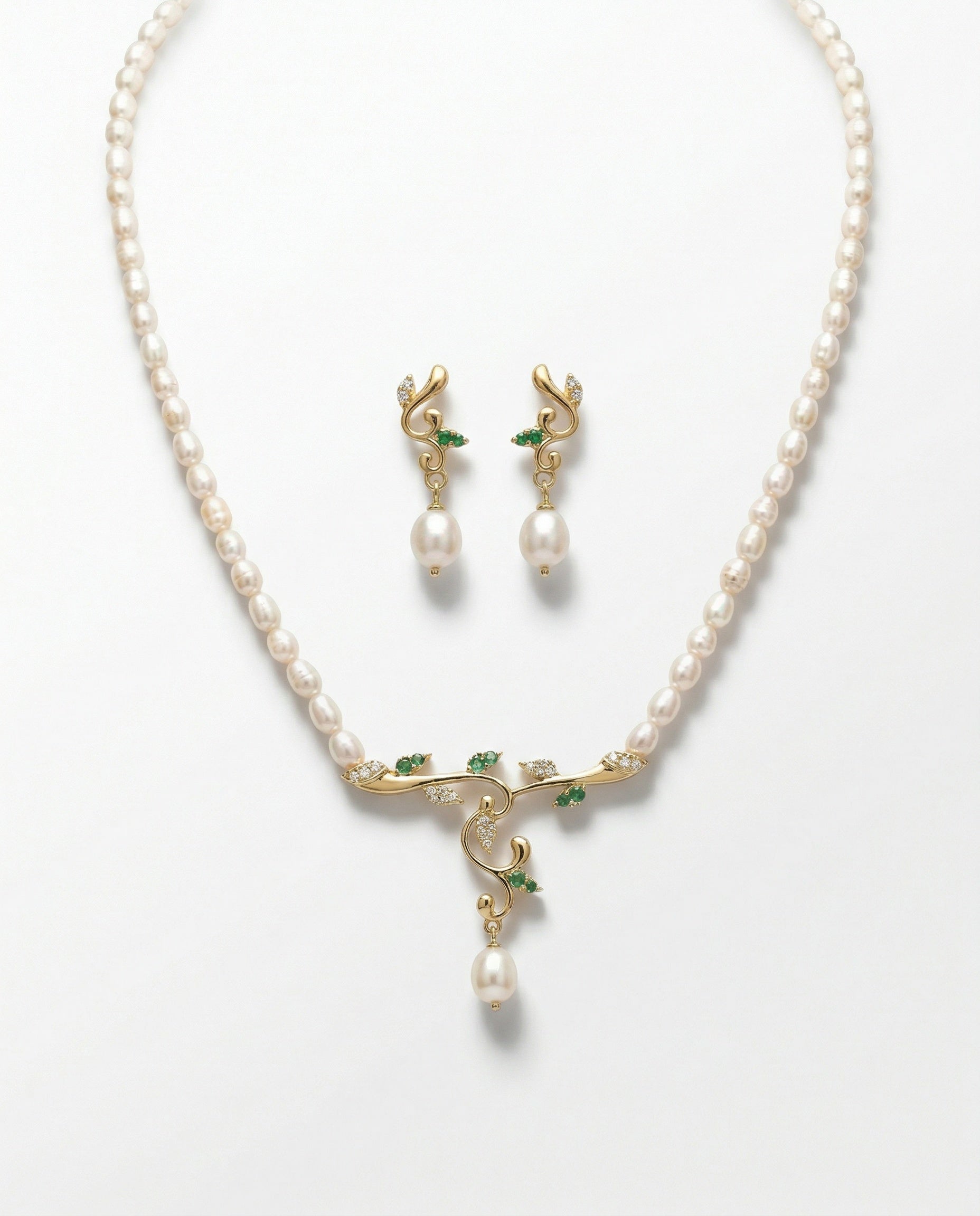 Embrace the beauty of nature with this exquisite Pearl and Emerald "Vine" Suite. This set combines the timeless purity of white pearls with the vibrant energy of green emeralds, all set in a flowing, organic gold design that mimics the graceful curves of a climbing vine.