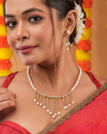 This modern yet traditional necklace features dainty pearl strings suspended from a gold base, forming a cascading effect. Paired with matching fringe-style earrings, it is perfect for cocktail parties, sangeet, or fusion ensembles.