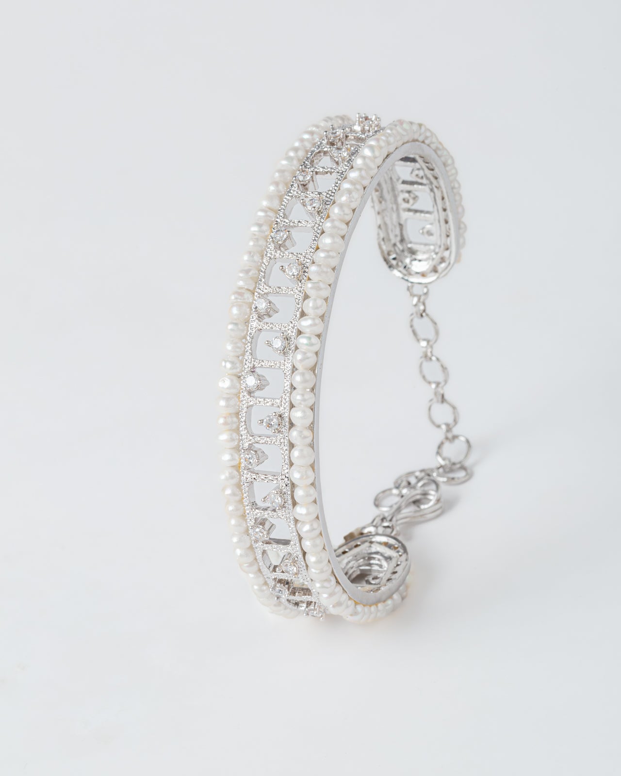 Elegant and timeless, this bangle features a refined geometric CZ design bordered by perfectly aligned pearls along both edges. The clean silver finish adds versatility, making it suitable for both special occasions and everyday chic styling. With its understated yet luxurious look, this bangle is a must-have piece for lovers of classic sophistication