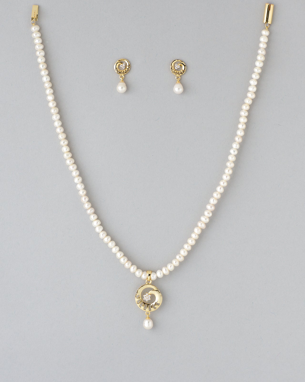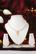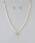 A timeless single-layered pearl necklace paired with circular gold floral motif earrings. The centerpiece features a delicate ring of crystals set in gold, radiating understated sophistication. Perfect for festive occasions and elegant soirees.