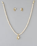 A timeless pearl necklace set featuring a delicate string of pearls adorned with a gold and pearl pendant. Paired with matching pearl drop earrings, this set exudes elegance and simplicity, perfect for both festive and party wear.
