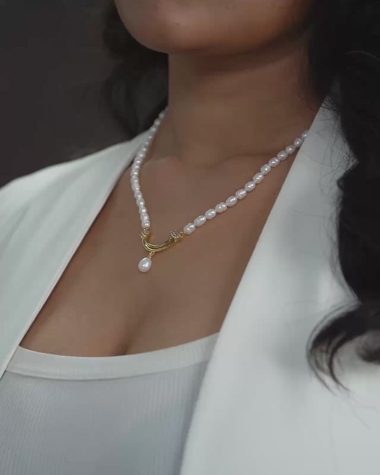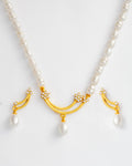 A timeless necklace set featuring lustrous white pearls accented with a sleek gold-tone curved pendant and pearl drop. Completed with matching earrings, this set is perfect for elegant occasions and traditional celebrations.