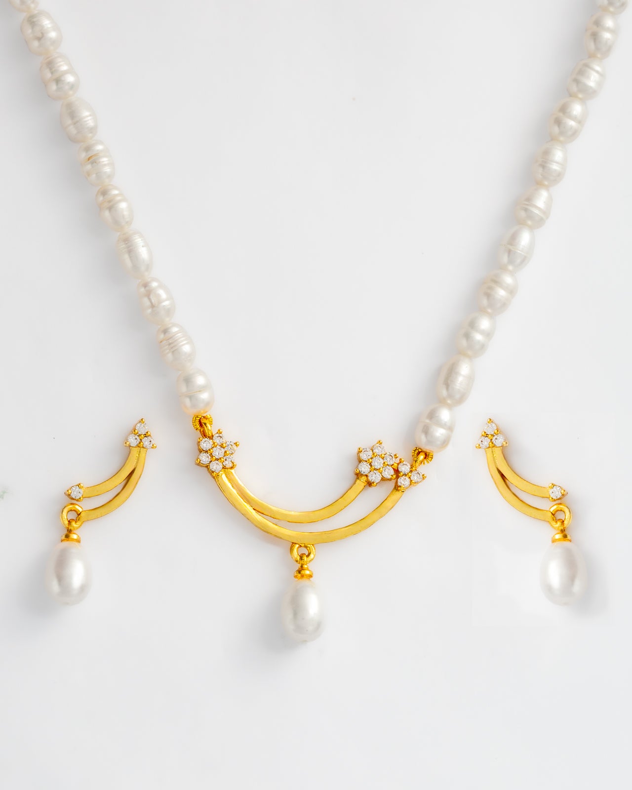 Classic White Pearl Necklace Set with Gold Curve Pendant