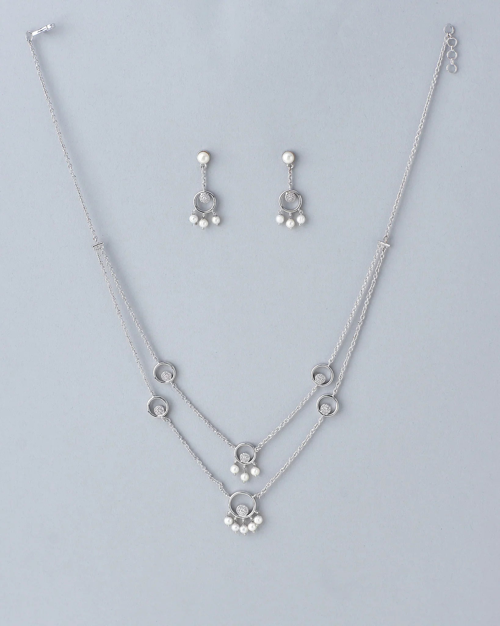 A stunning combination of beauty and brilliance this necklace and earring set showcases shimmering CZ stones and pearl in a delicate design Crafted for those who love sophisticated sparkle