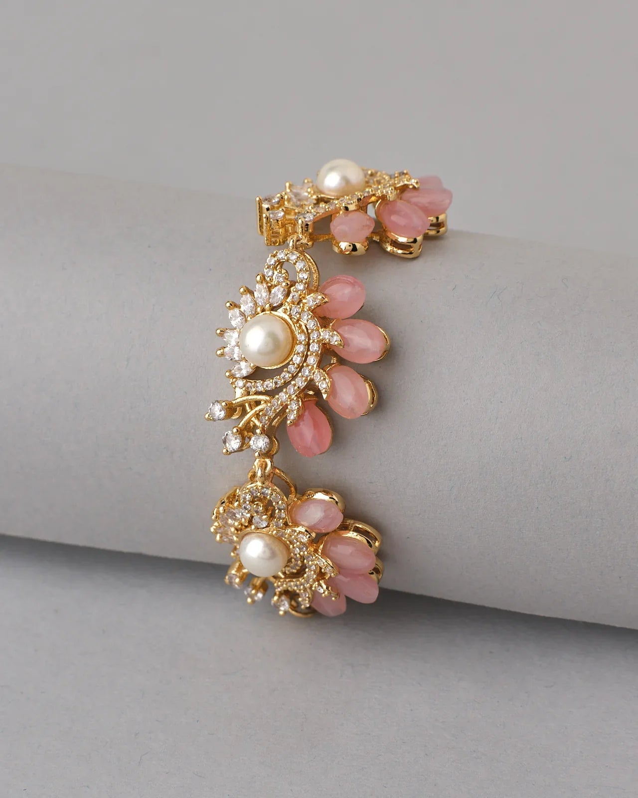 Featuring luminous pearls as the highlight of its design, this bracelet radiates festive elegance. Accented with sparkling CZ stones and soft pink crystal drops, it adds charm and brilliance.Perfect for Diwali celebrations, weddings, and festive gatherings – a blend of tradition and luxury.