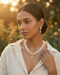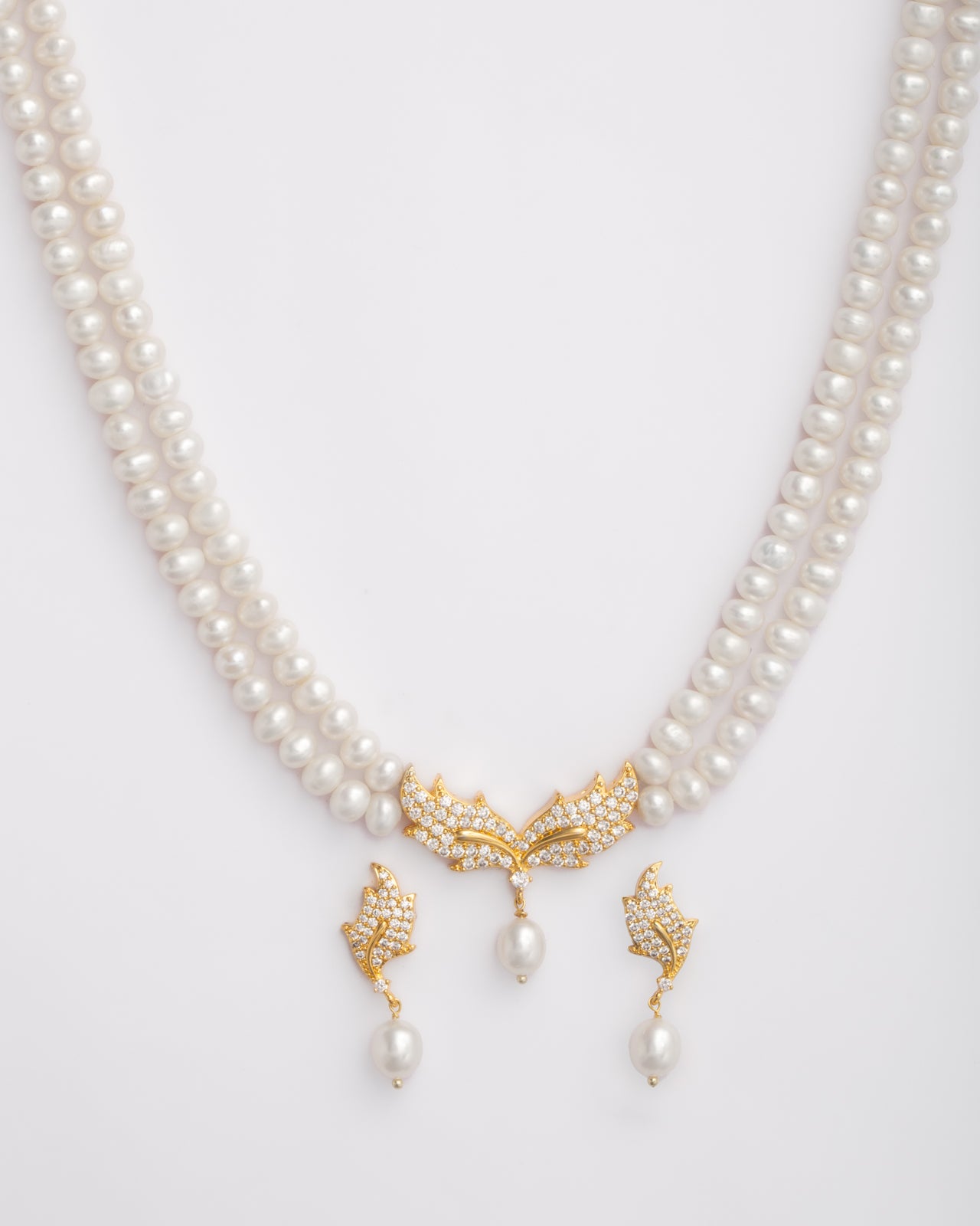 A luxurious double-strand necklace set crafted with lustrous white pearls, highlighted by an ornate gold-tone centrepiece adorned with CZ stones. Paired with matching earrings, this elegant set is perfect for weddings, festive occasions, and grand celebrations.