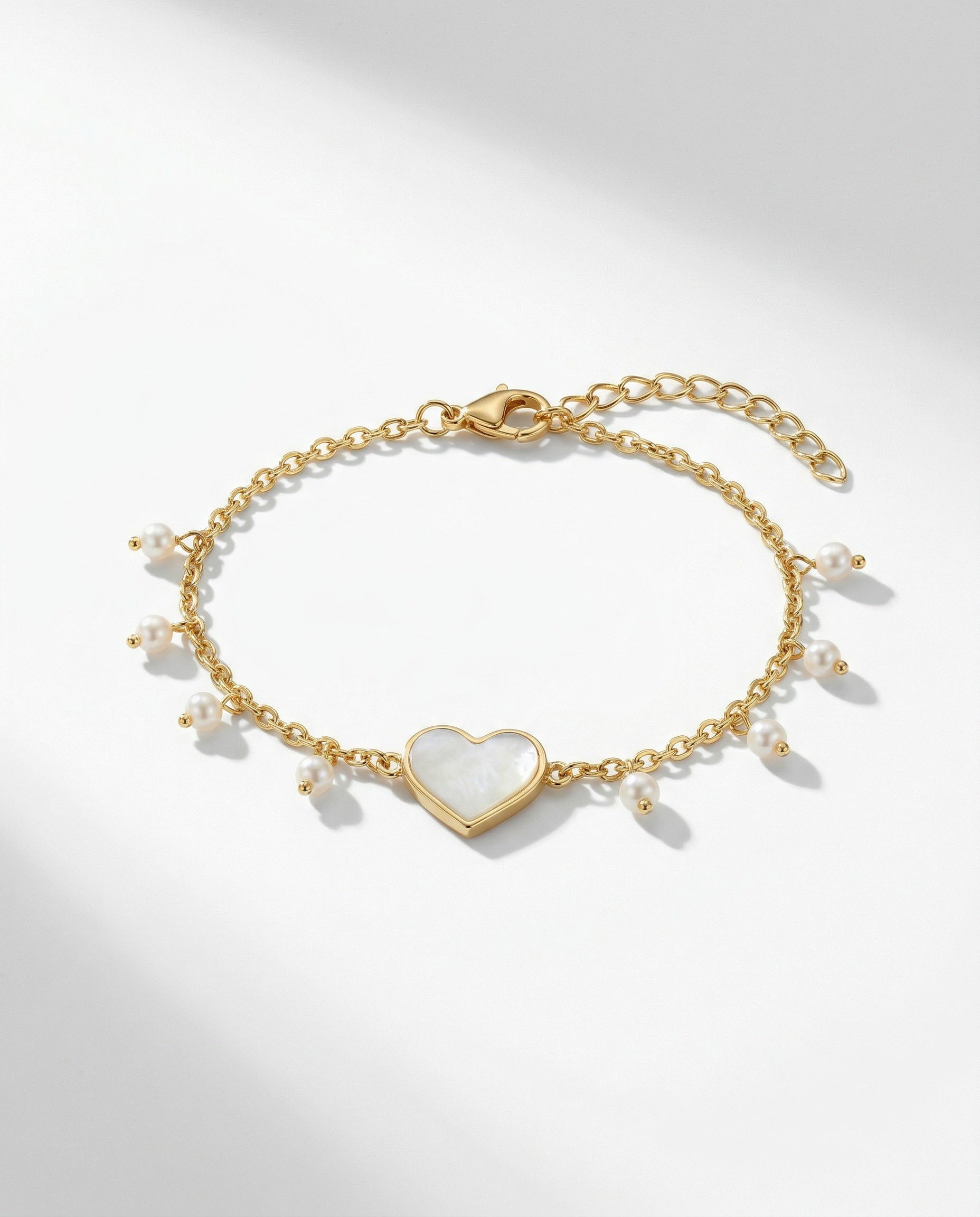 Elevate your everyday elegance with this stunning, vintage-inspired charm bracelet. Featuring a central heart-shaped pendant with a luminous, marbled inlay, this piece is perfectly complemented by delicate pearl charms that dance along a shimmering gold-tone chain.