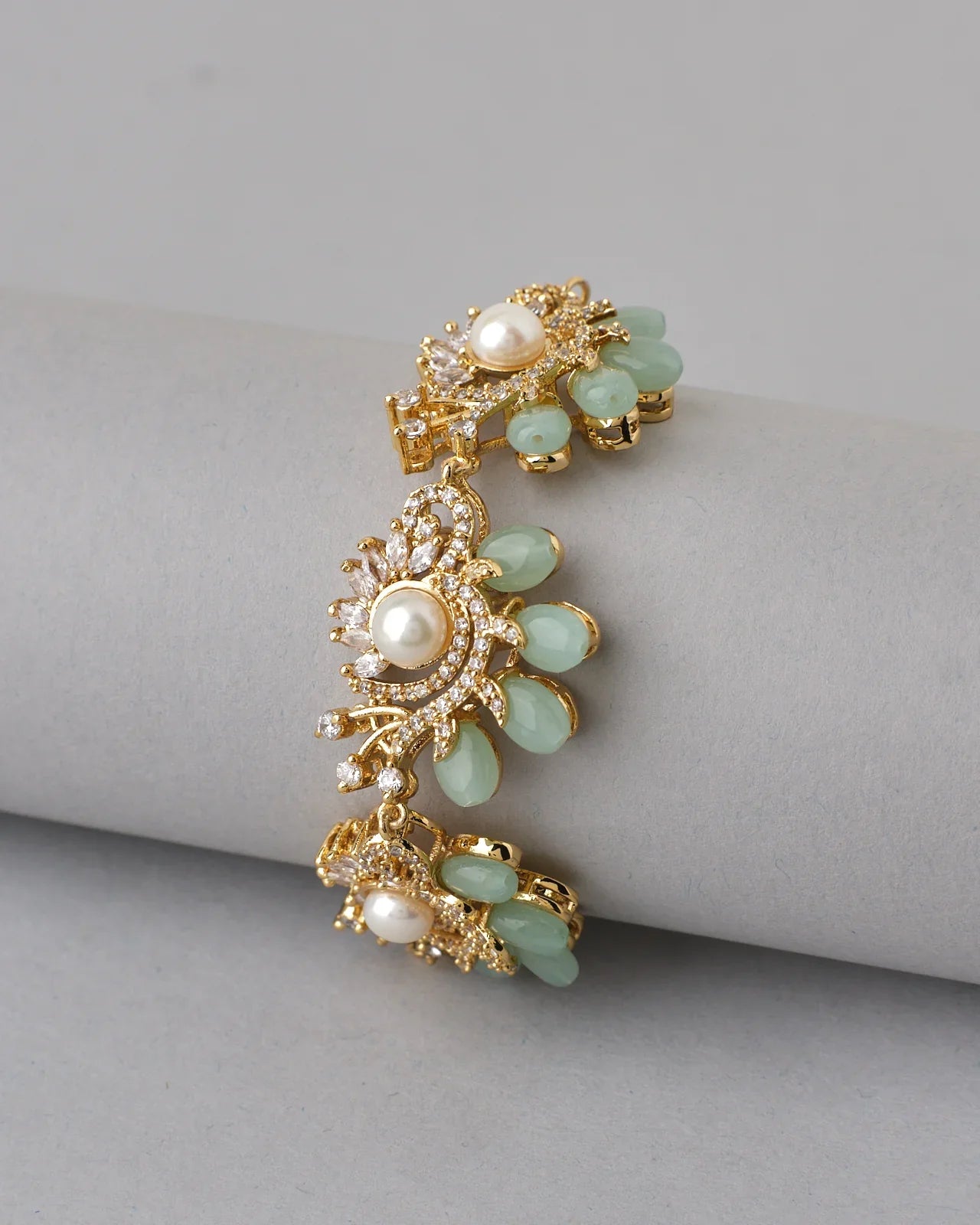 Gold-tone bracelet embellished with shimmering white stones and soft green drops.