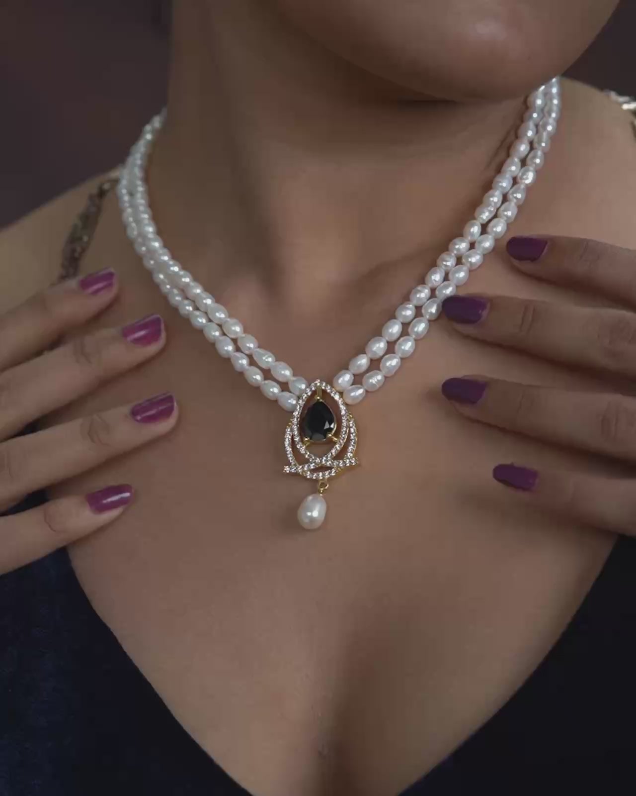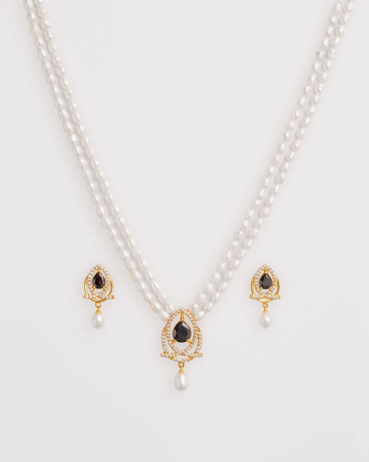 A graceful multi-strand pearl necklace highlighted with a black stone pendant framed by sparkling CZ accents, paired with matching earrings. Perfect for festive occasions and sophisticated ethnic styling.