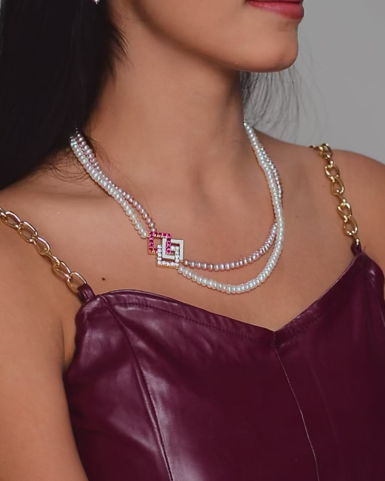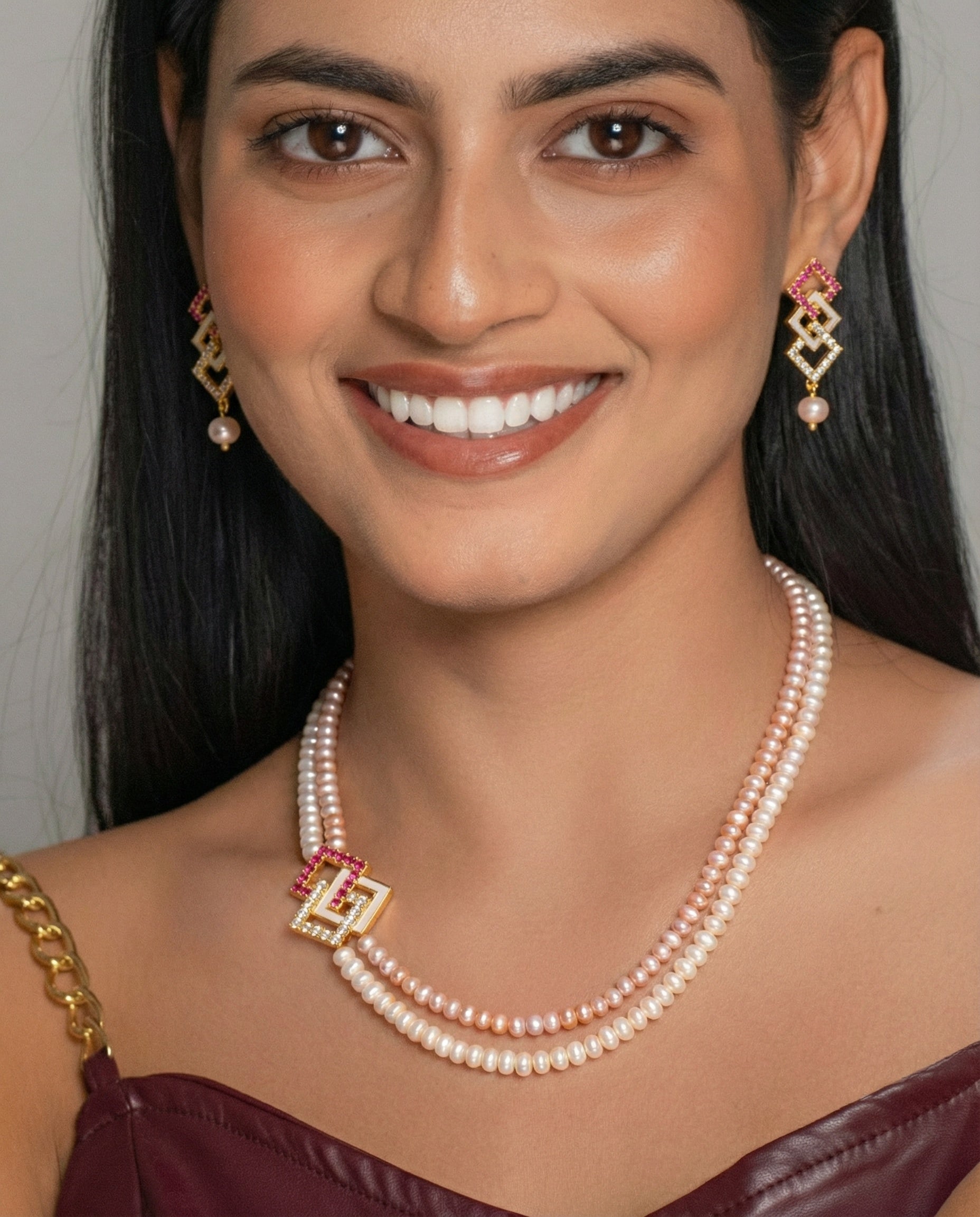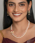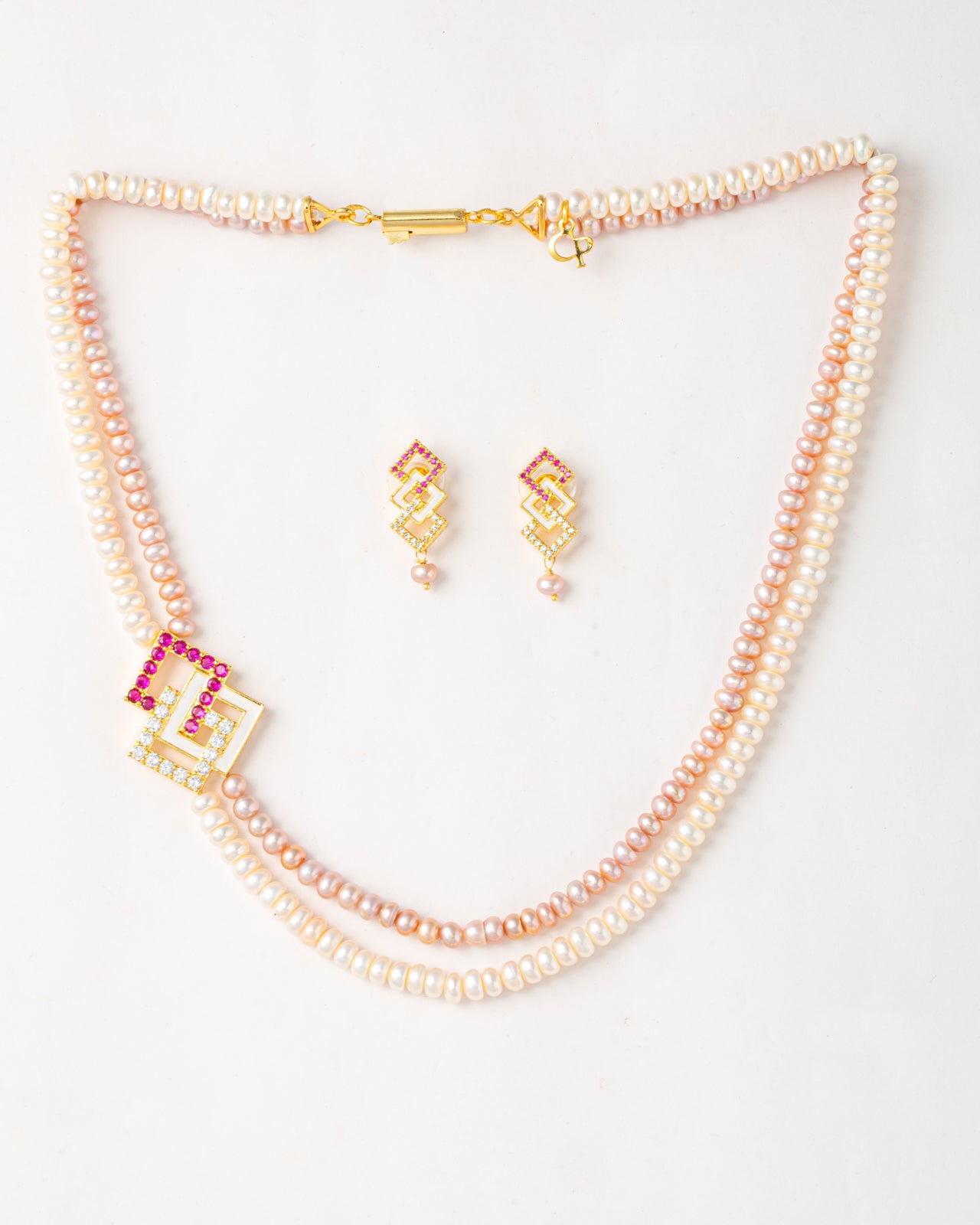 This stunning necklace set features a dual-strand arrangement of premium freshwater pearls in soft pink and white shades. The centrepiece is a modern geometric pendant embellished with sparkling CZ stones and ruby-coloured accents. Paired with matching earrings, this set blends tradition with contemporary elegance, making it perfect for weddings, parties, and festive occasions.