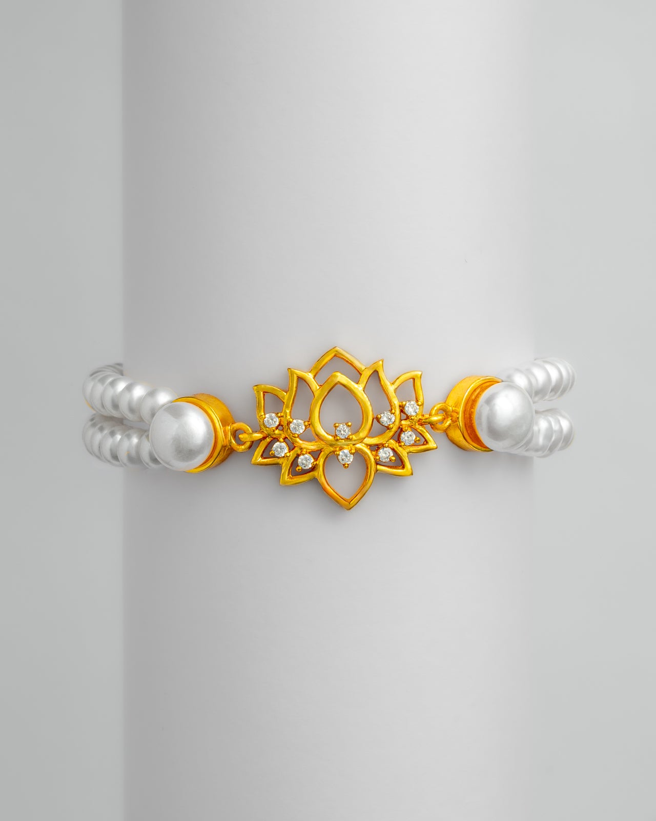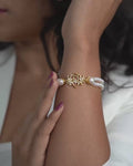 A delicate bracelet featuring classic white pearls accented with a graceful gold-tone floral motif. Perfect for adding a touch of timeless elegance to everyday wear or special occasions.