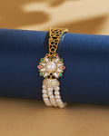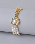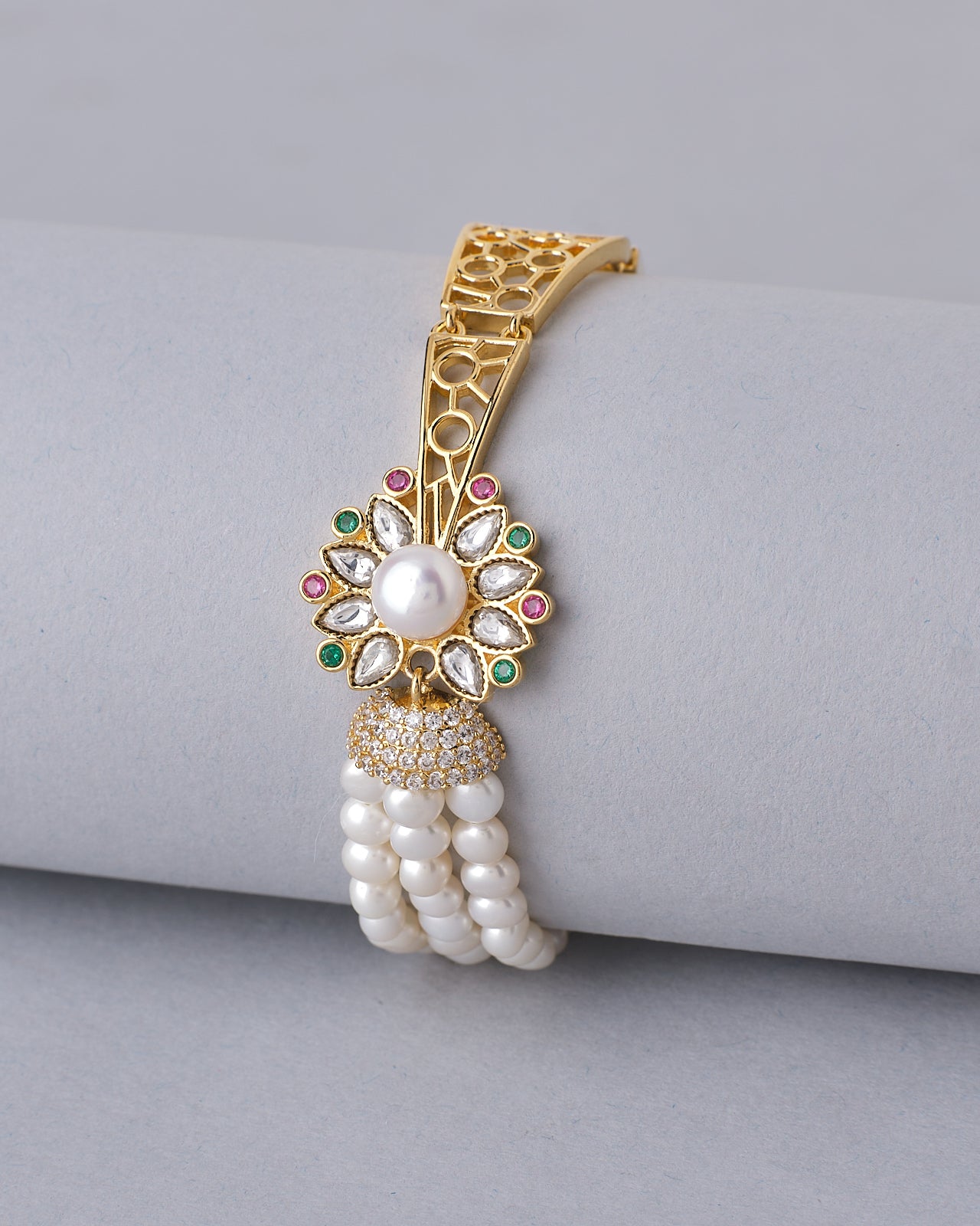 Inspired by traditional floral artistry, this bracelet showcases a central pearl surrounded by marquise-cut CZ stones, highlighted with vibrant green and pink accents. Finished with multiple strands of pearls, this design beautifully blends heritage charm with contemporary elegance.
