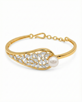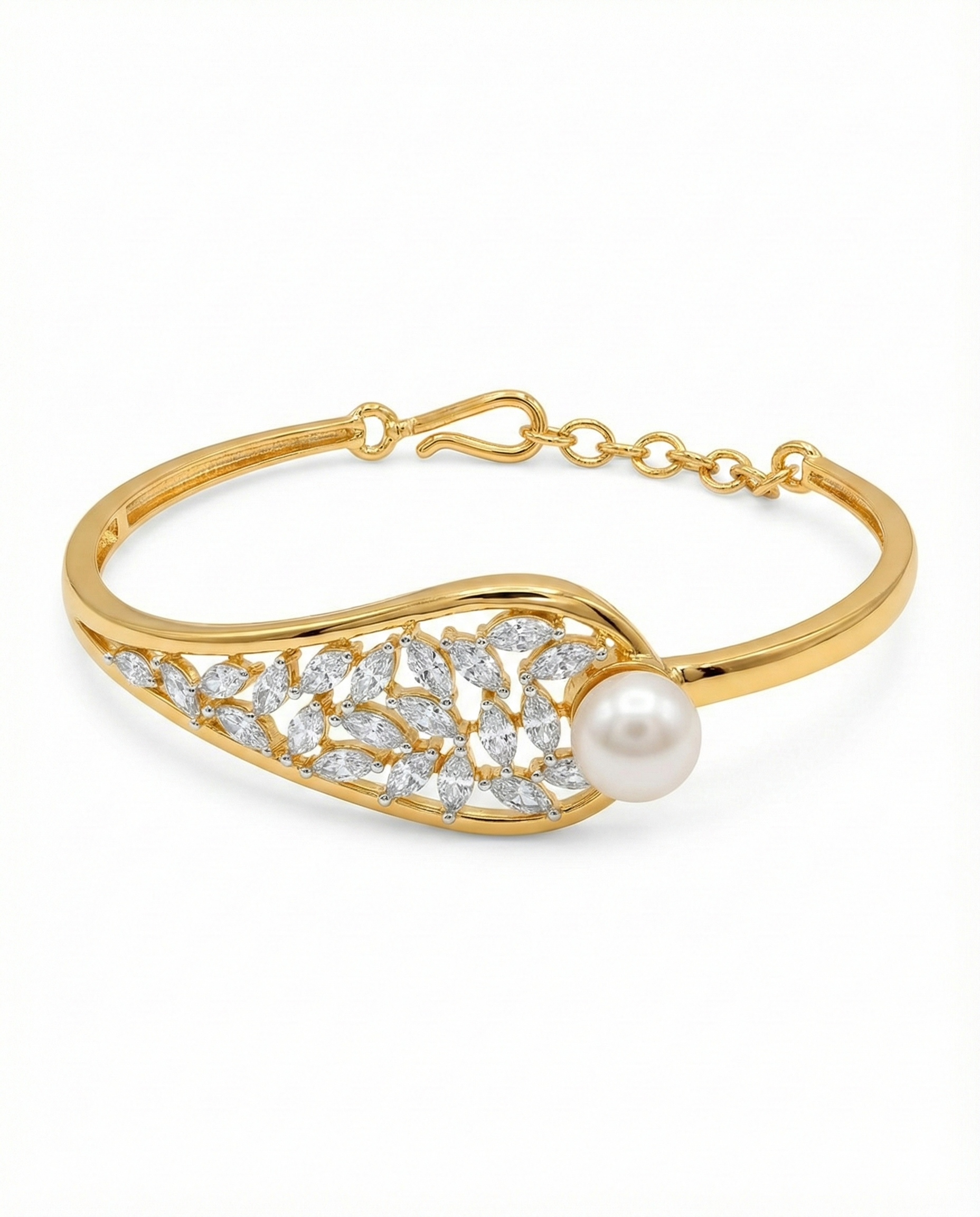 Adorn your wrist with the grace of the Celestial Bangle, a masterpiece of jewellery design that captures the movement of wind-swept leaves. This piece combines a high-polish gold finish with the fiery brilliance of marquise-cut stones, finished with a single, radiant pearl for an air of timeless luxury.