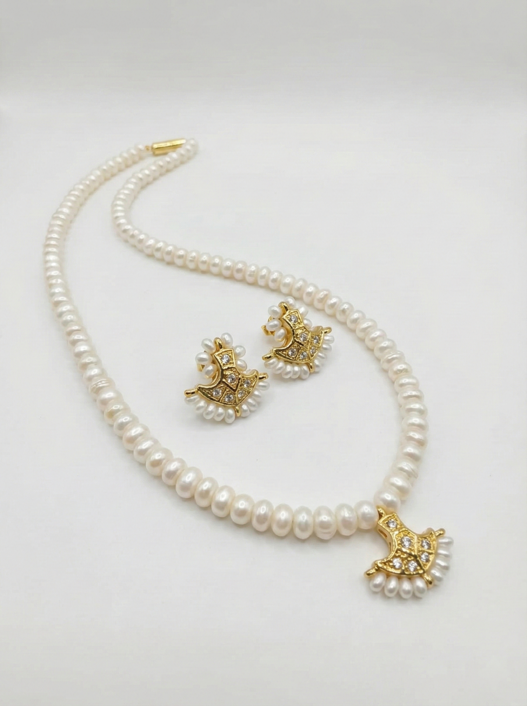 Step into the spotlight with our Fan Motif Pearl Jewellery Set, a masterfully crafted ensemble that blends geometric precision with the soft allure of nature. This set is designed for the woman who appreciates jewellery that serves as both a classic accessory and a modern piece of art.