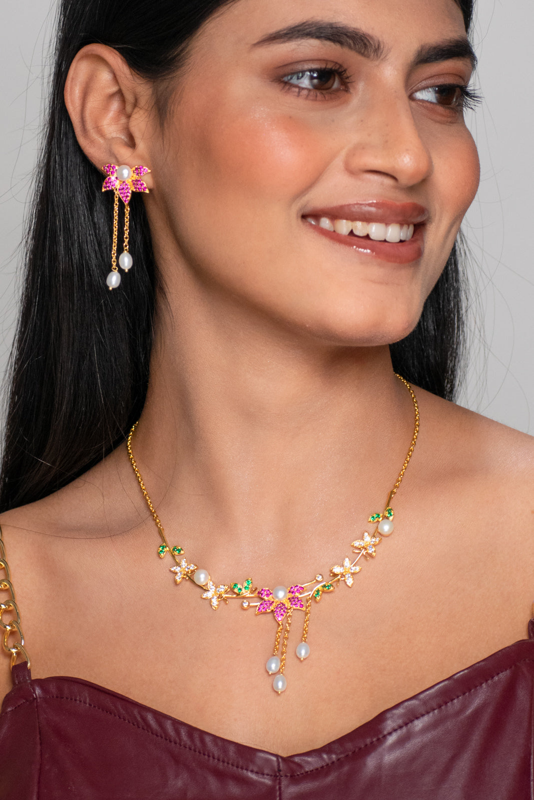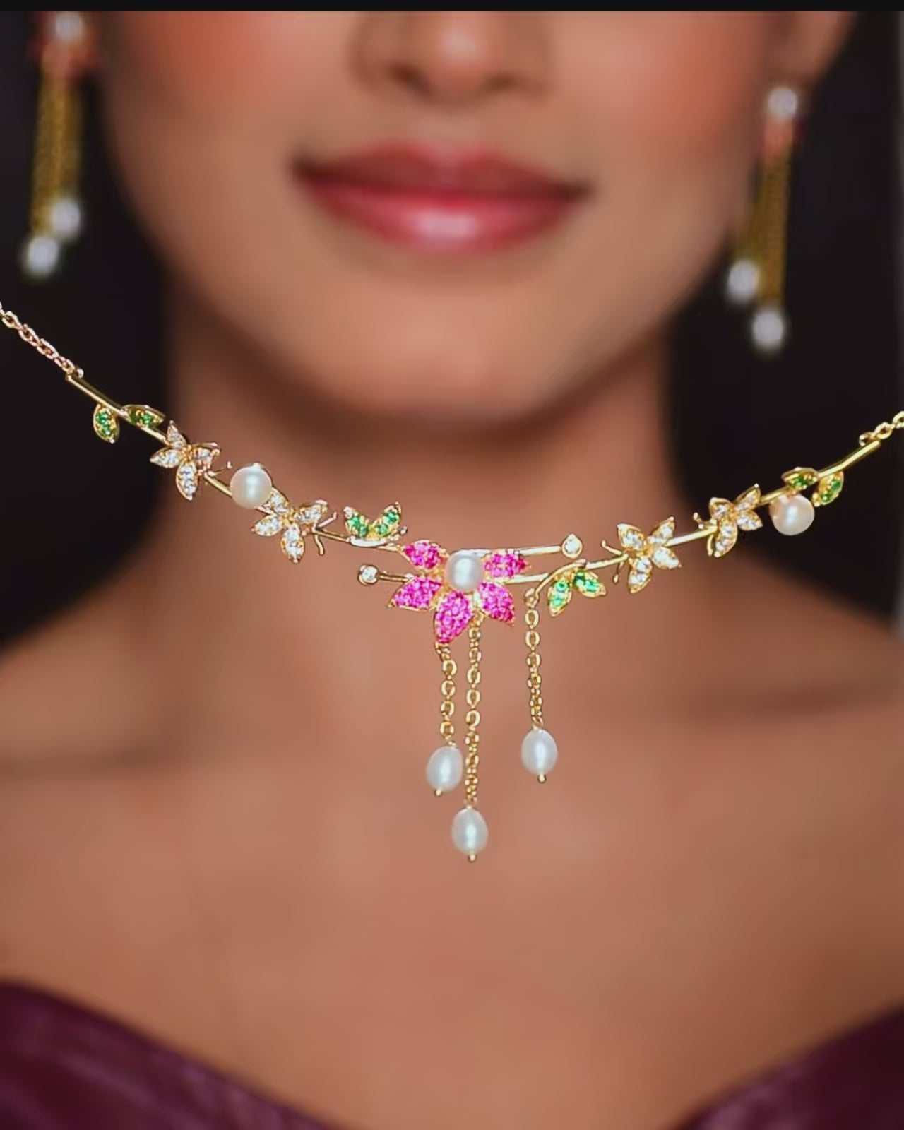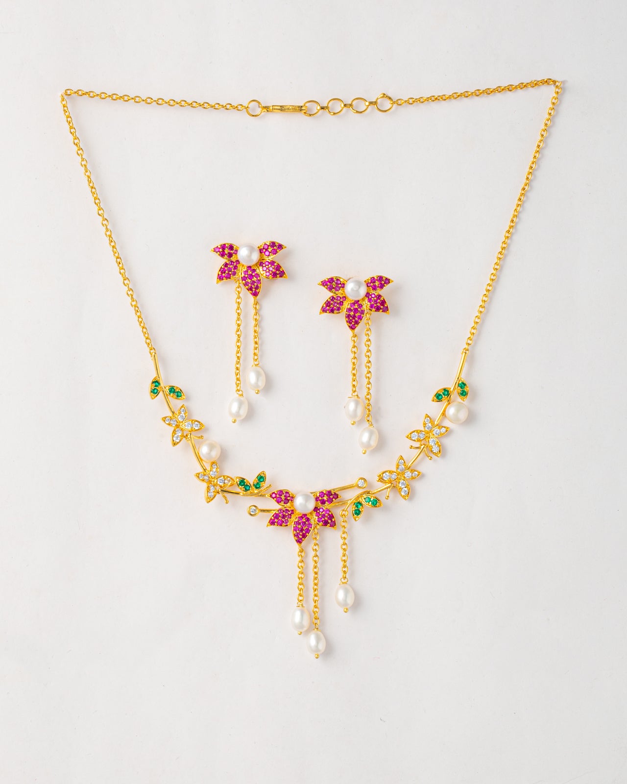 A luxurious gold-plated necklace featuring intricate floral motifs, studded with vibrant pink and green stones. Dangling freshwater pearls add movement and charm. This statement set includes matching earrings, perfect for bridal wear, festivals, and special celebrations.