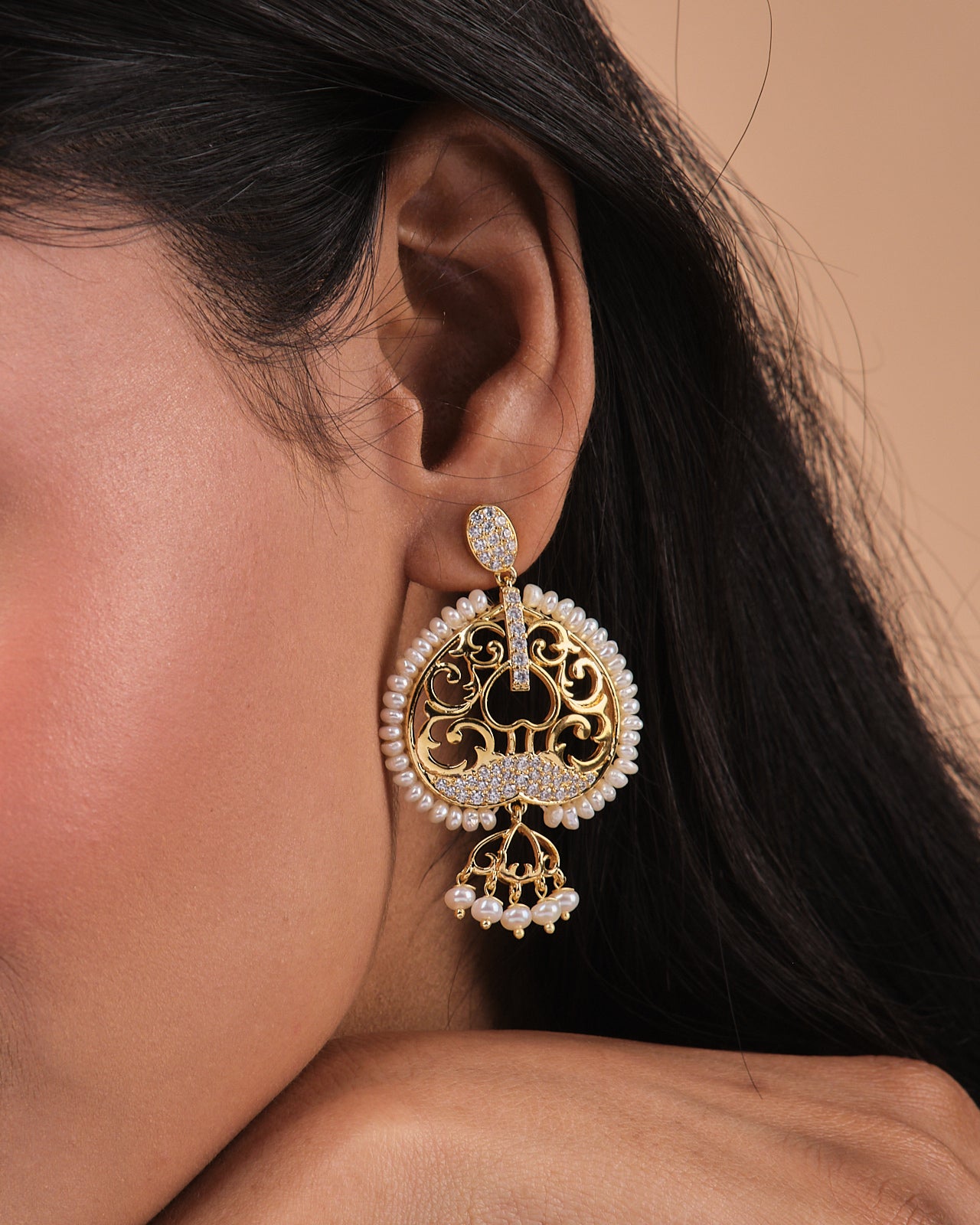 Intricately carved filigree earrings framed with delicate pearls and CZ highlights.