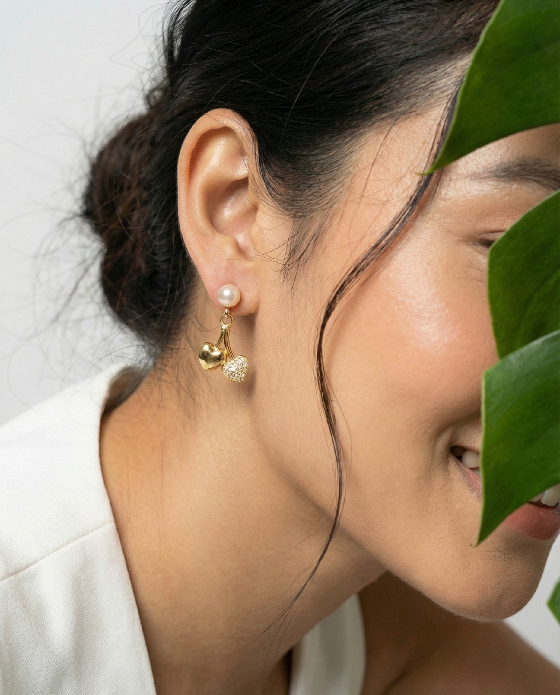Add a playful yet sophisticated touch to your jewellery collection with these unique twin-heart drop earrings. Inspired by a whimsical cherry silhouette, this design features two polished gold-tone hearts suspended from a lustrous pearl.