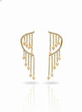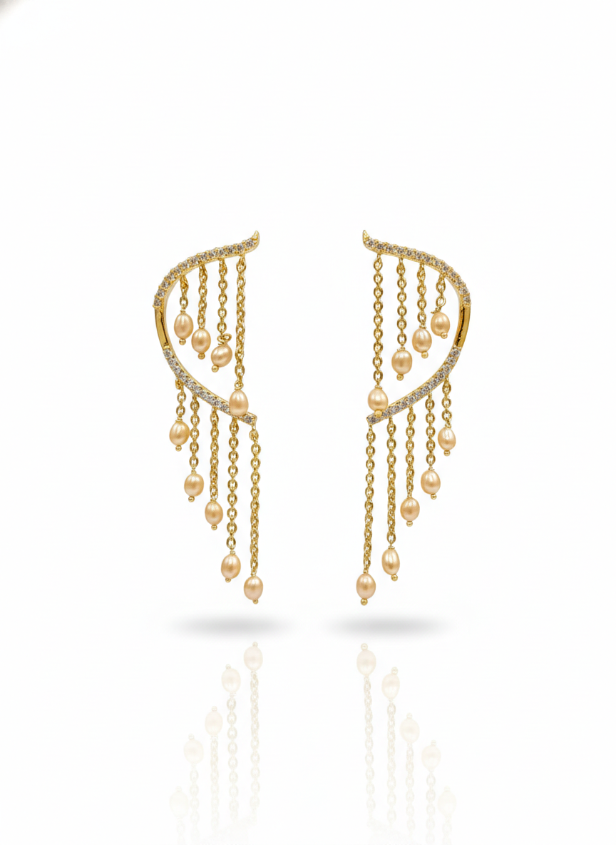 These unique earrings feature a dramatic, curved wing-like arch encrusted with a double row of shimmering micro-crystals. From this structured frame, multiple delicate gold-tone chains descend in varying lengths, creating a "waterfall" or tassel effect. Each chain is punctuated with a lustrous, cream-colored seed pearl, giving the piece a refined, organic finish.