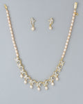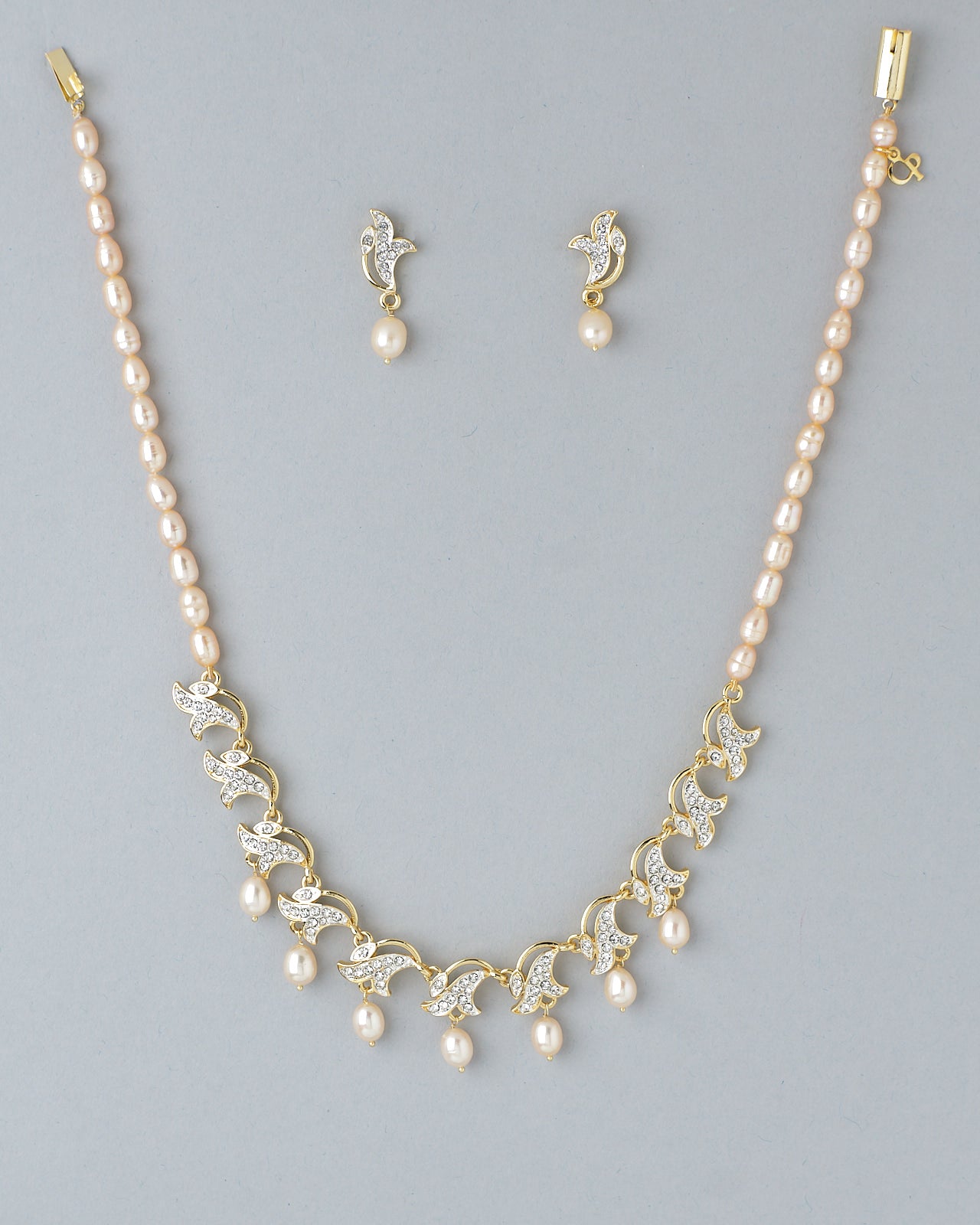 A charming pearl and CZ-studded necklace with leaf-pattern detailing and graceful pearl drops. The soft gold finish exudes bridal sophistication, ideal for wedding ceremonies and evening receptions.