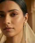 Each earring features a luminous round white pearl nestled atop a beautifully crafted golden fan or crown motif. The high-polish gold-tone frame curves downward in a scalloped silhouette, with delicate "rays" extending outward. Each ray is tipped with a brilliant crystal, creating a shimmering halo effect that draws the eye and beautifully frames the central pearl.