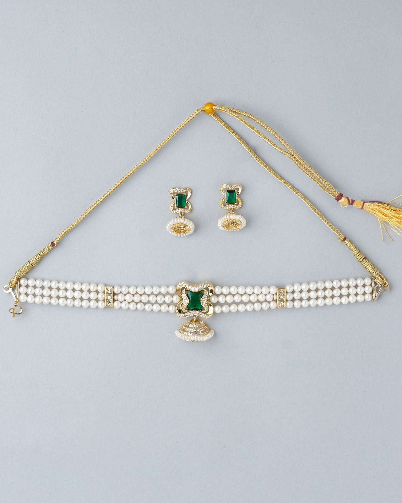Radiate timeless elegance on your special day with this exquisite bridal pearl jewellery set. Featuring lustrous pearls delicately paired with sparkling accents, this ensemble perfectly complements both traditional and modern bridal looks. Ideal for weddings, receptions or engagement ceremonies.