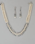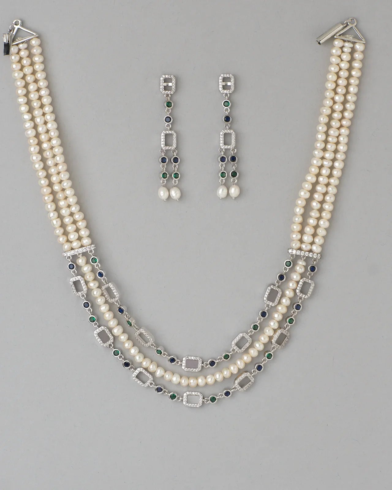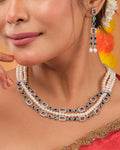 This exquisite set features three rows of lustrous pearls, beautifully accented with sparkling CZ stones and green highlights. The matching earrings add perfect balance, making it a complete festive and bridal accessory. A statement piece designed to bring timeless elegance and grandeur to Diwali celebrations and weddings.
