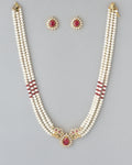 A royal style necklace combining pearls, colorful stones, and gold filigree work. The grand earrings complement the gemstones, ideal for bridal and traditional celebrations.