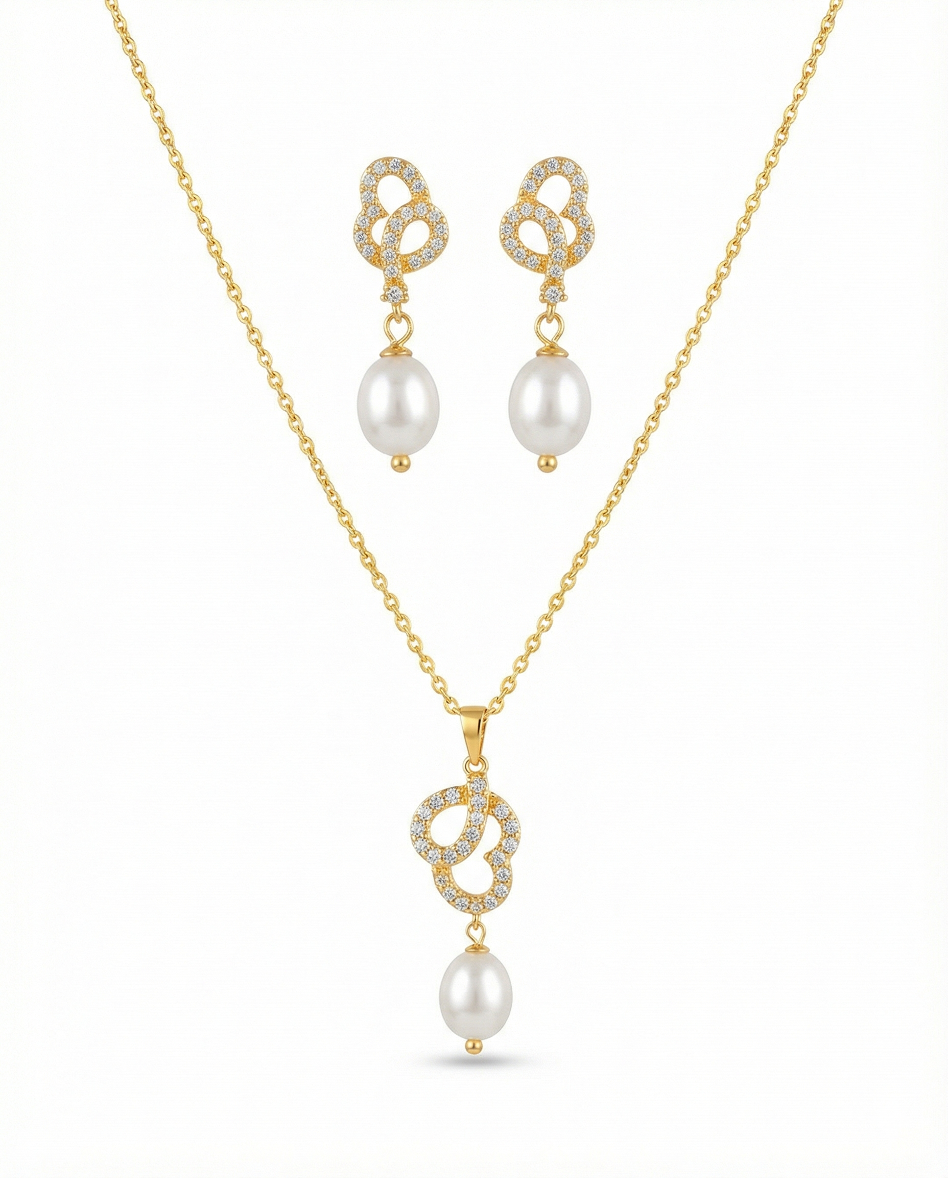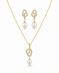 Intertwined Heart Pearl Drop Pendant with Earrings Set in 925 Silver