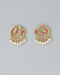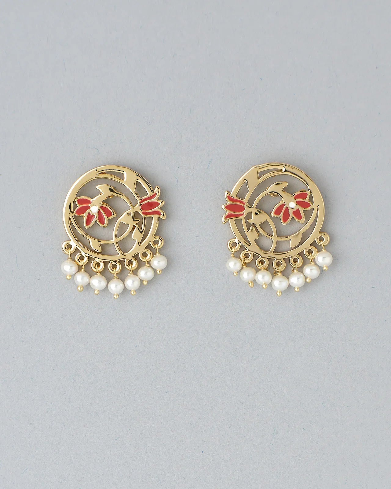 Inspired by nature, these round golden earrings are detailed with delicate red enamel lotus motifs and finished with a fringe of pearl drops. Lightweight yet striking, they make a graceful accessory for cultural events, festive celebrations, or daily elegance.