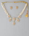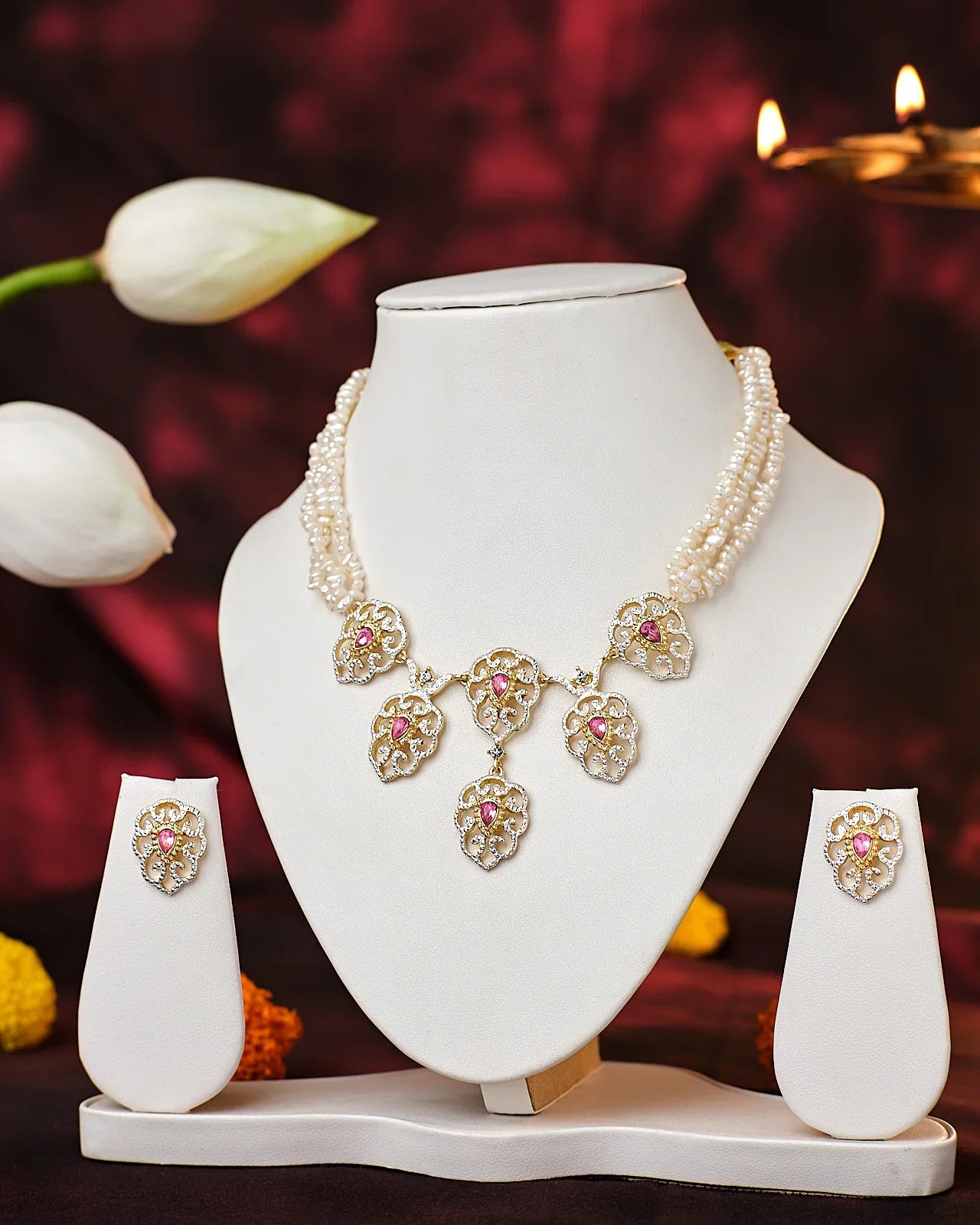 This graceful necklace is adorned with pink enamel lotus motifs and dangling pearls, creating a divine blend of tradition and modernity. The matching earrings mirror the lotus design, making it ideal for cultural celebrations and temple wear.