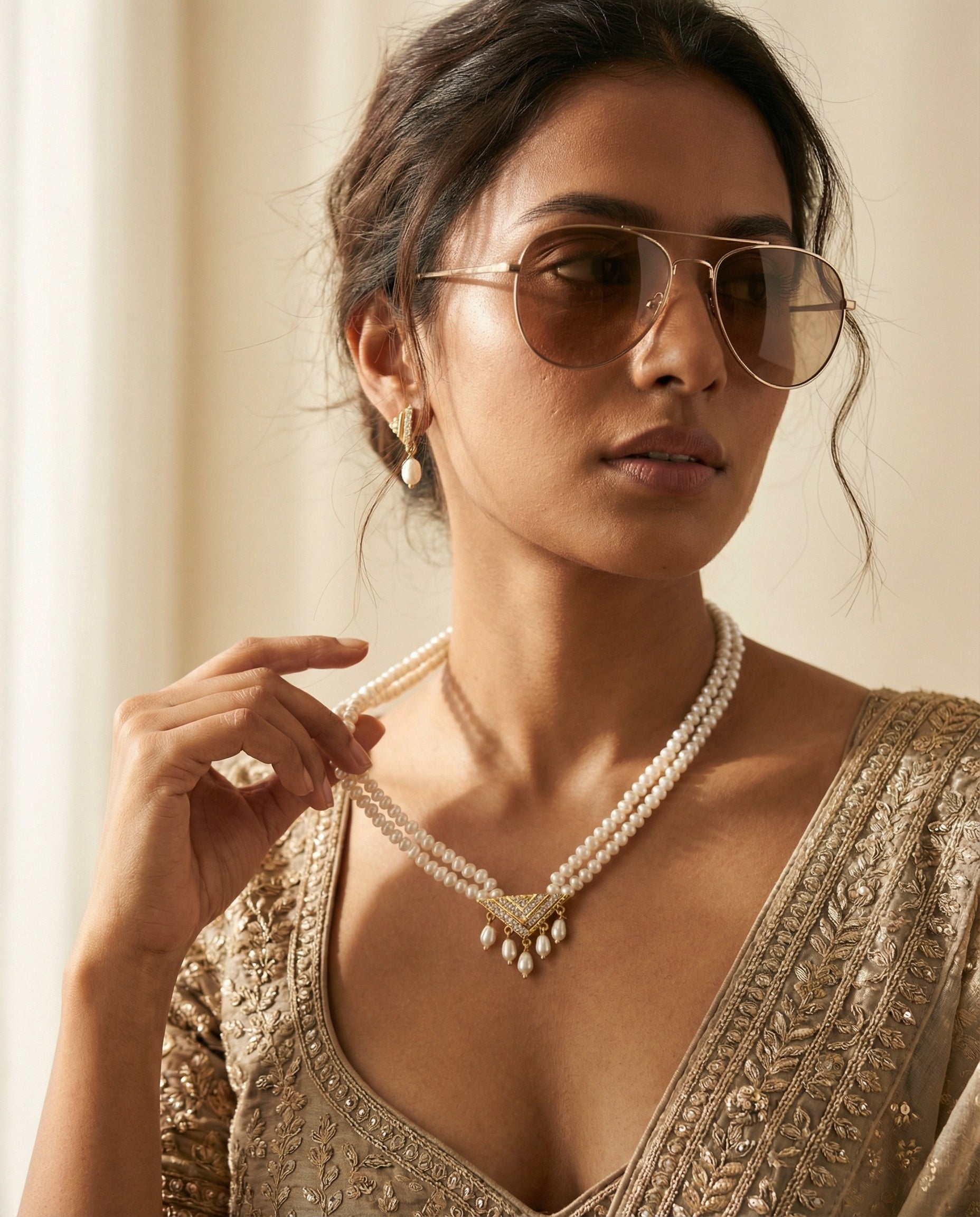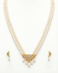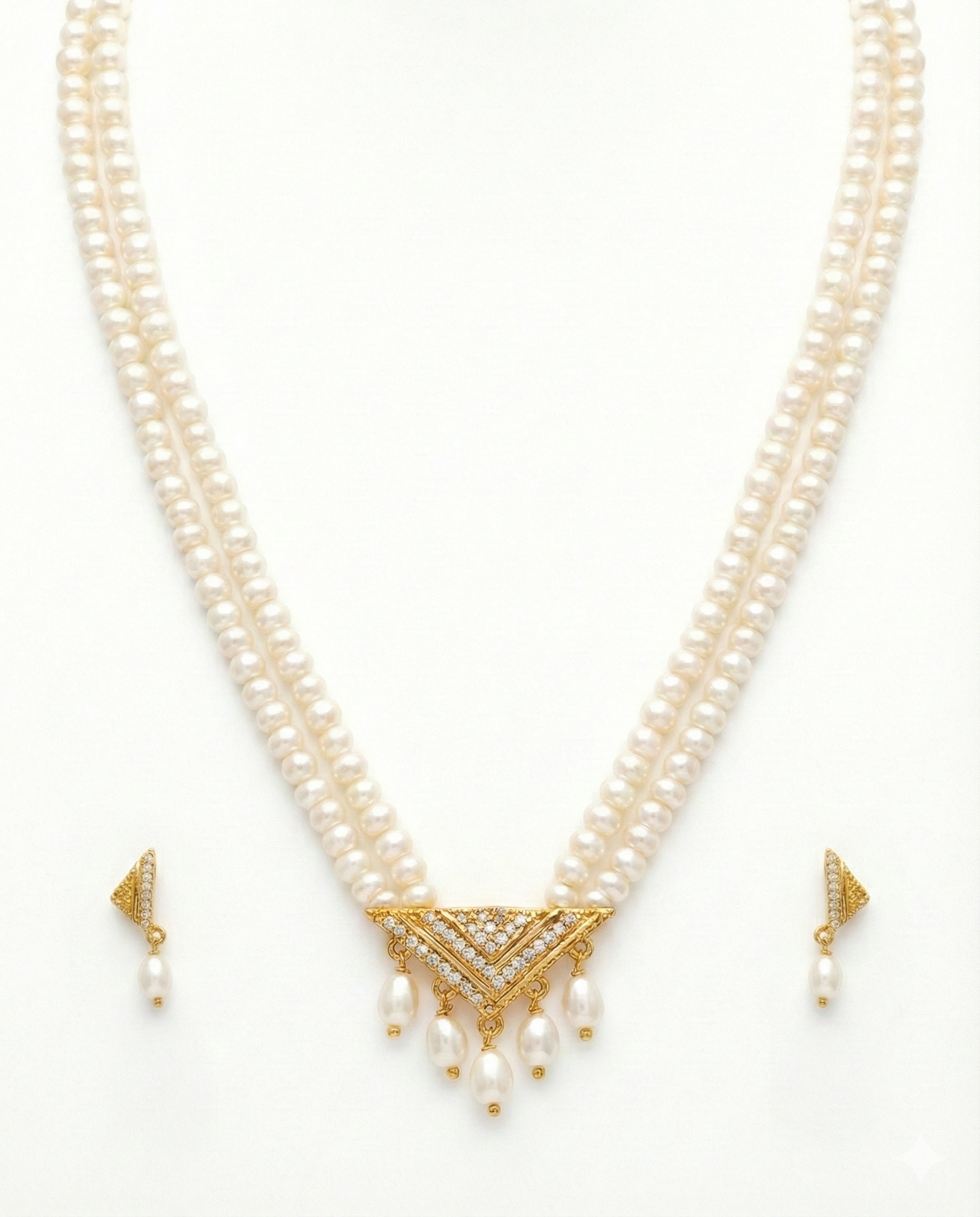 Capture the essence of modern royalty with this exquisite Double-Strand Pearl Jewellery Set. This coordinated suite, featuring a dramatic necklace and matching drop earrings, balances the soft lustre of traditional pearls with bold, gold-tone architectural elements and sparkling pavé accents.
