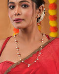 A delicate single-strand pearl necklace featuring a round golden pendant with a diamond accent and a pearl drop. Matching earrings complete the subtle yet elegant design, perfect for daily wear, gifting, or minimal bridal looks.