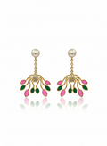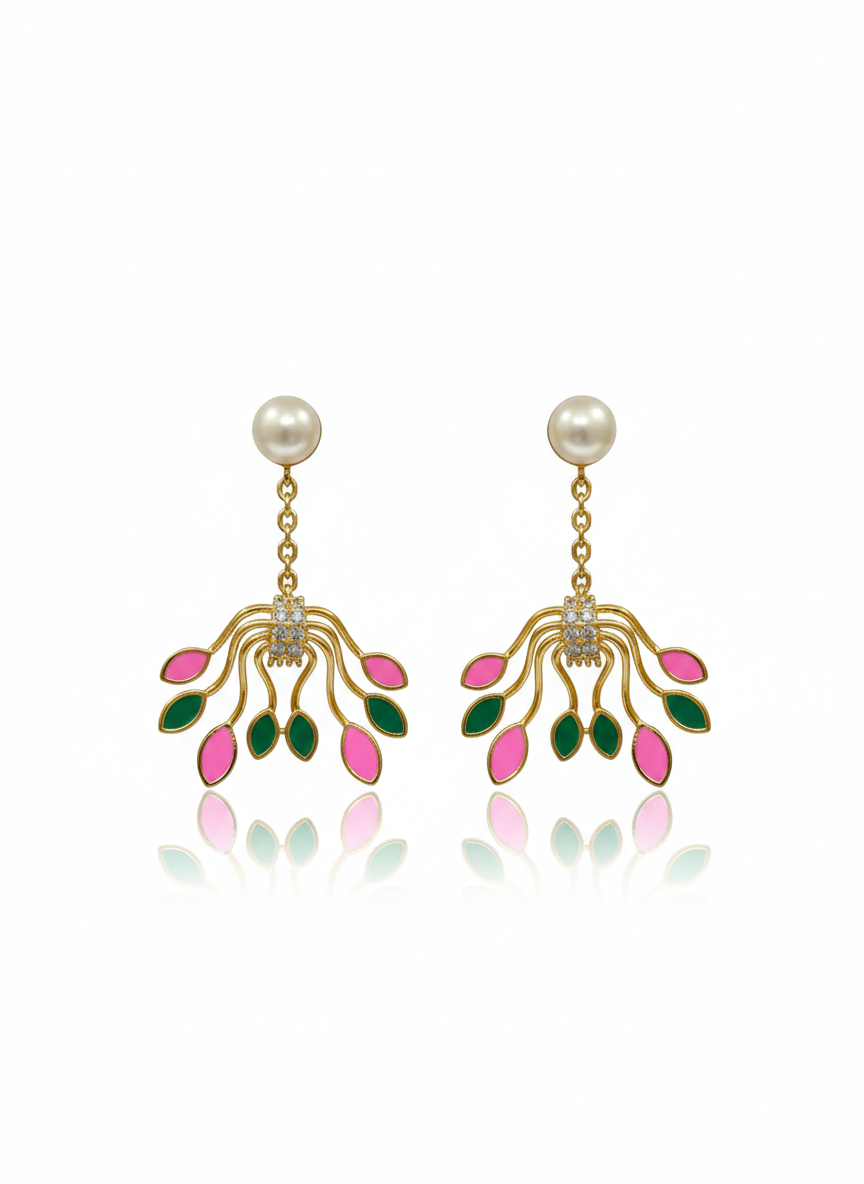 These earrings feature a sophisticated multi-tier construction starting with a luminous round white pearl at the post. Suspended by a delicate golden chain is a dramatic, fan-like botanical motif. The gold-tone branches curve outward, tipped with vibrant pink and emerald green enamel leaves that create a lively, organic silhouette. At the centre of the floral cluster, a small band of sparkling pavé-set crystals adds a touch of high-end brilliance.