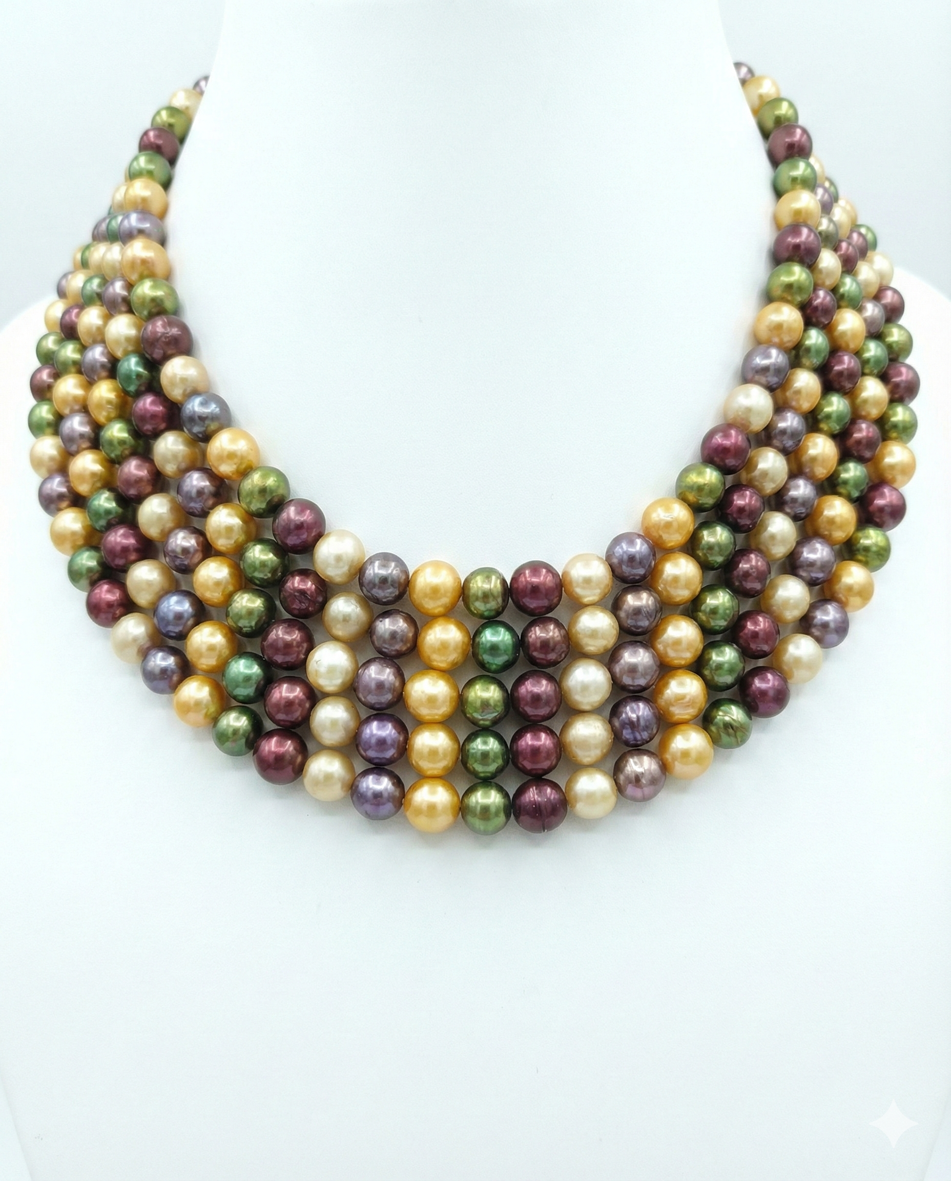 Elevate your jewellery collection with this exquisite five-strand pearl statement necklace. Designed to capture the eye, this piece features a sophisticated "bib" style arrangement that sits gracefully along the collarbone, offering a look of timeless luxury and modern boldness.