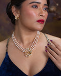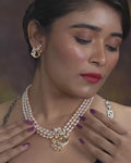 A refined double-strand blush pearl necklace featuring a CZ-studded swirl pendant, paired with matching earrings. Elegant and feminine, perfect for weddings and festive occasions.