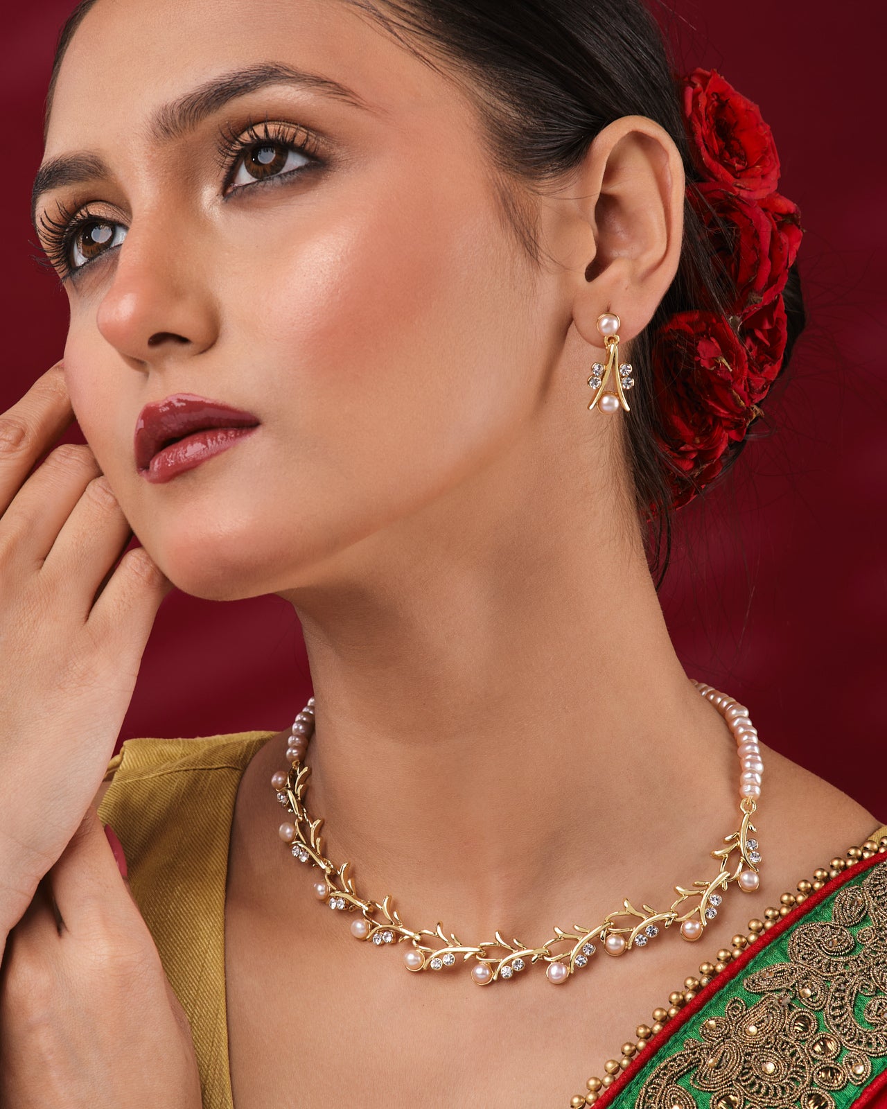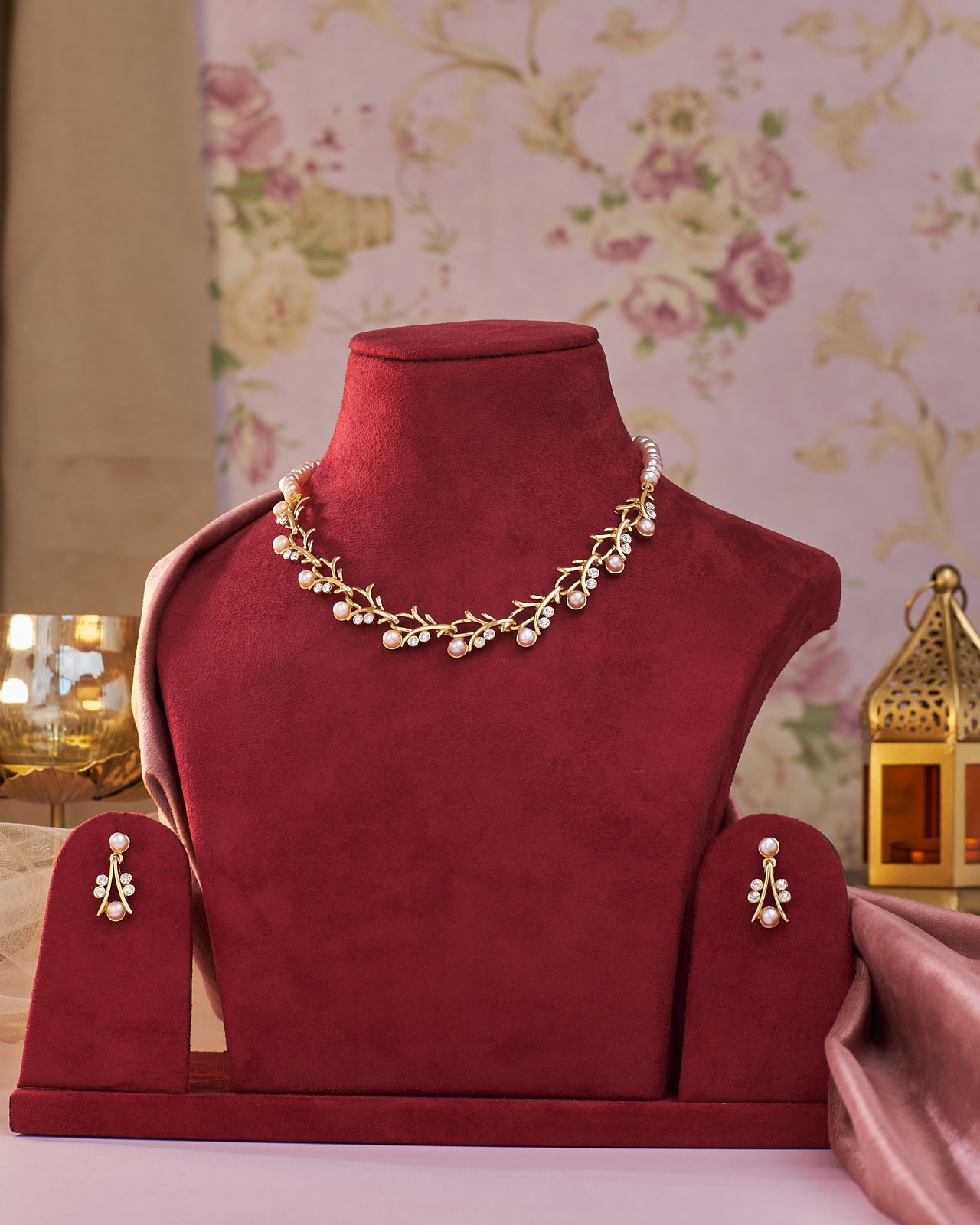 Clean lines and soft pearls in a contemporary design. Perfect for modern brides seeking simple sophistication. Includes a sleek necklace with delicate earrings.