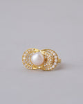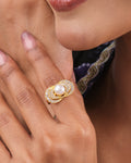 This exquisite ring showcases a radiant pearl encircled by swirling layers of brilliant CZ stones, creating a dynamic halo effect. The fluid, spiral design enhances the pearl’s natural glow, offering a statement of refined luxury ideal for festive wear or elegant evenings.