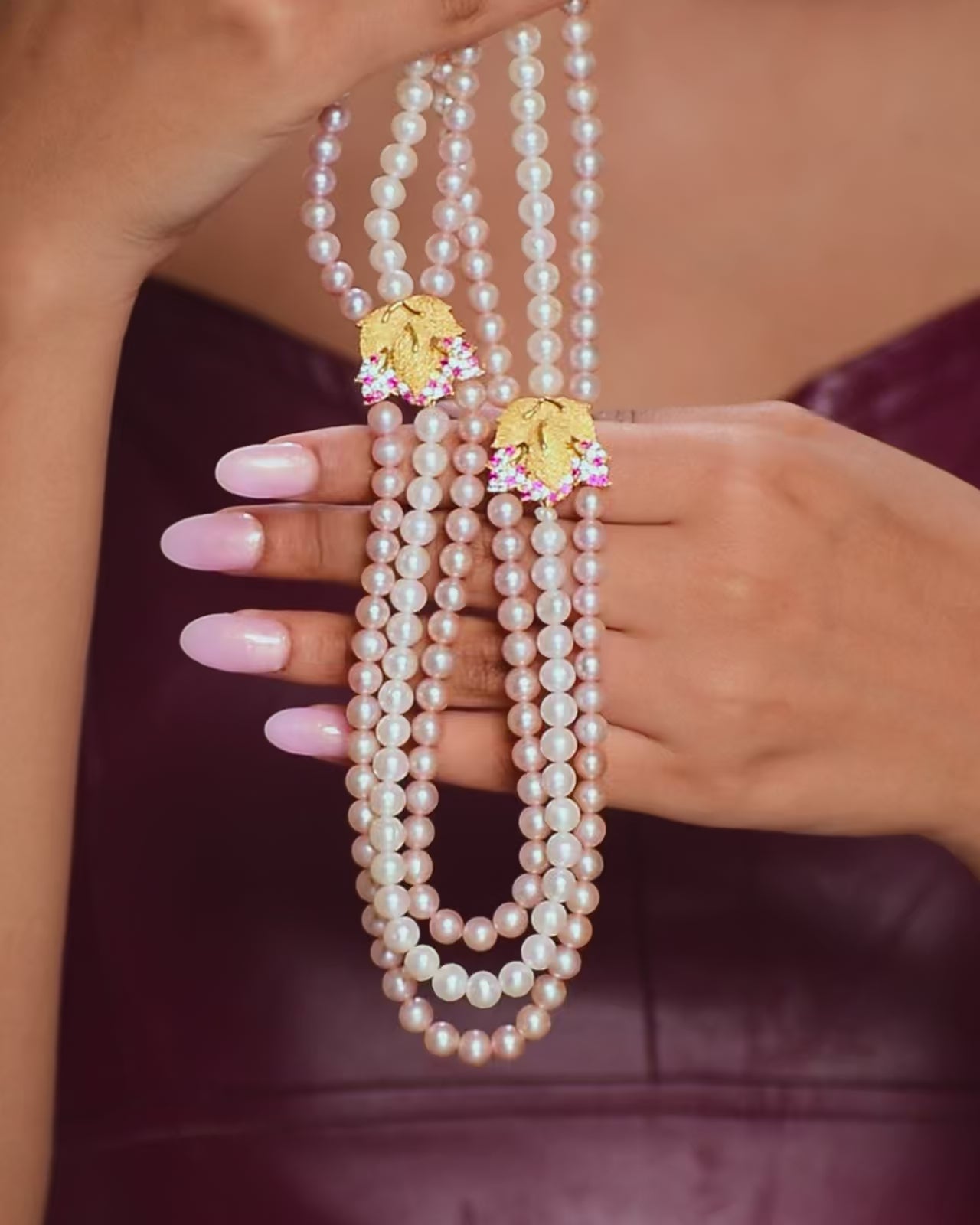 An elegant three-layer pink pearl necklace paired with intricately crafted floral gold-toned motifs. The pendant and earrings feature a blend of shimmering CZ stones and ruby accents, finished with delicate pearl drops. This set radiates feminine grace, making it ideal for weddings, festive wear, and traditional celebrations where soft hues and refined detailing shine beautifully.