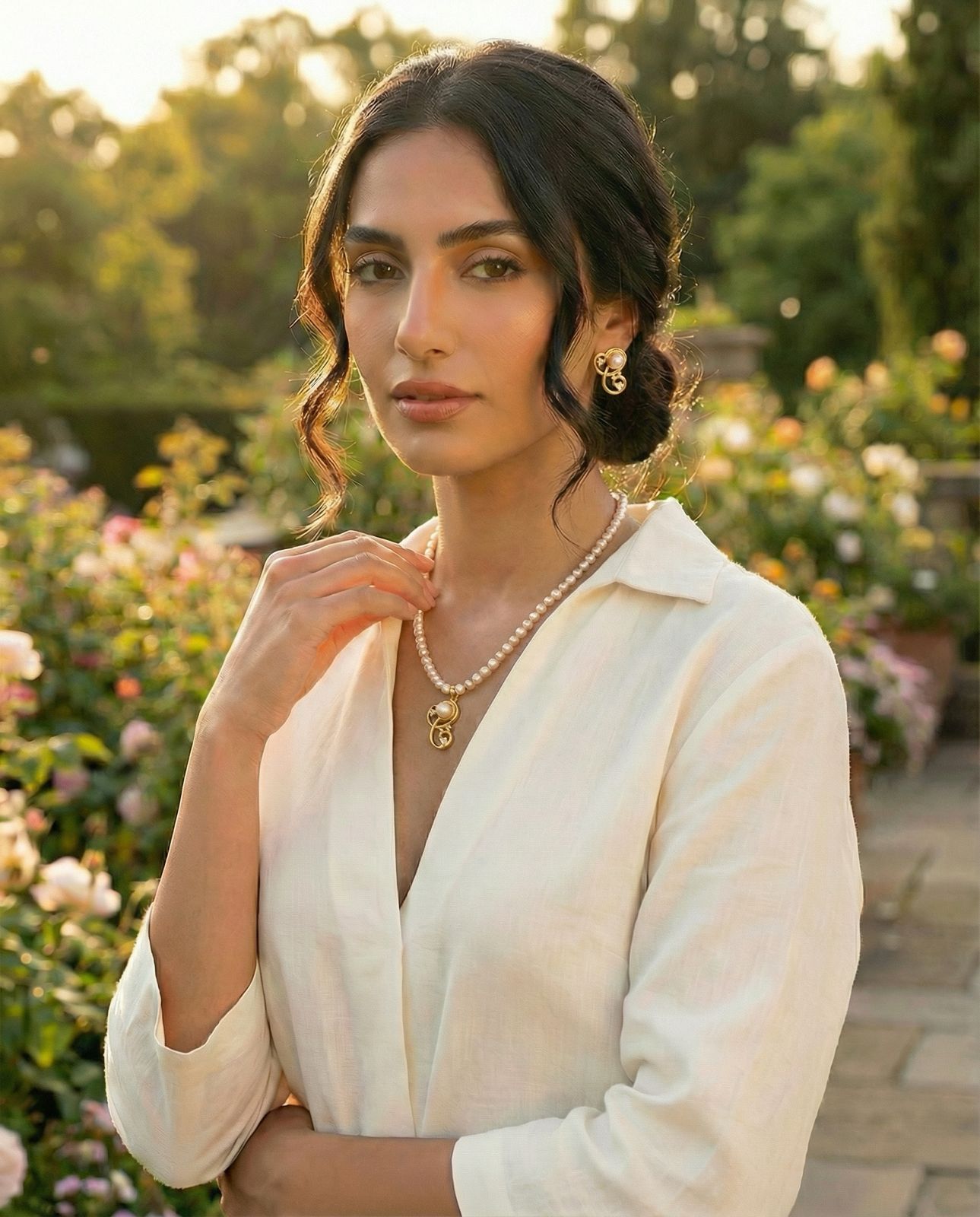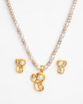 An elegant necklace set crafted with soft pink and white pearls, highlighted by a graceful gold-tone swirl pendant and matching earrings. A refined choice that adds classic charm and feminine elegance to traditional and festive looks.