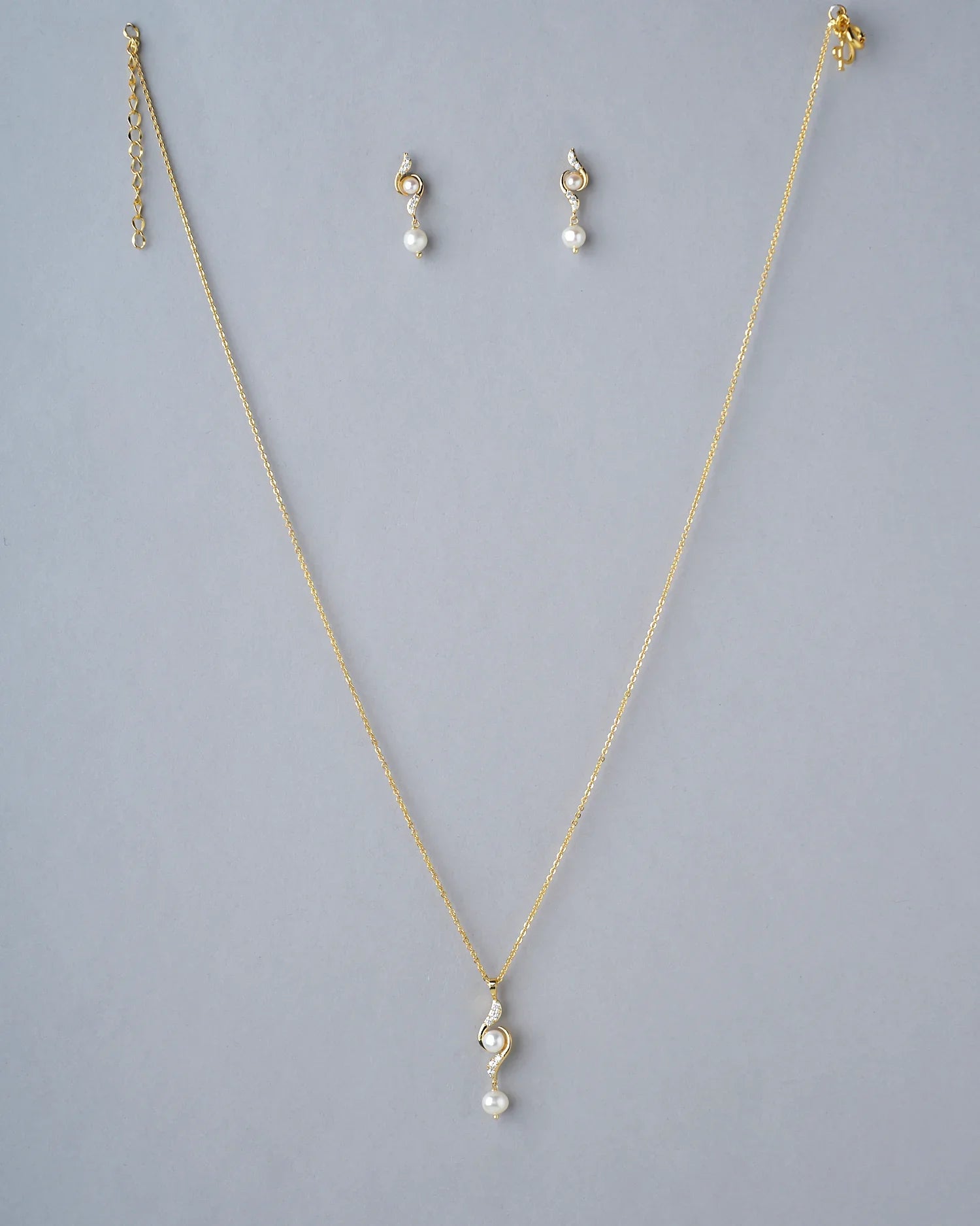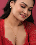 The Pretty Pendant Set by Chandrani Pearls India features a gold pendant and matching earrings with pearl and crystal accents, displayed elegantly on a white stand against a draped background.
