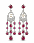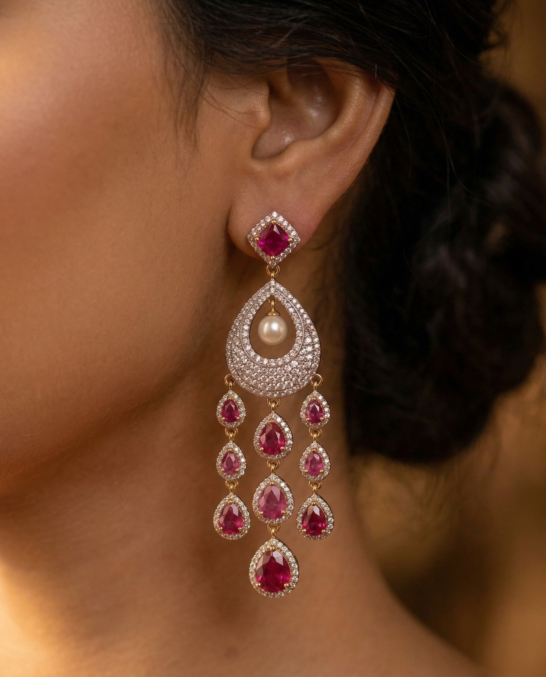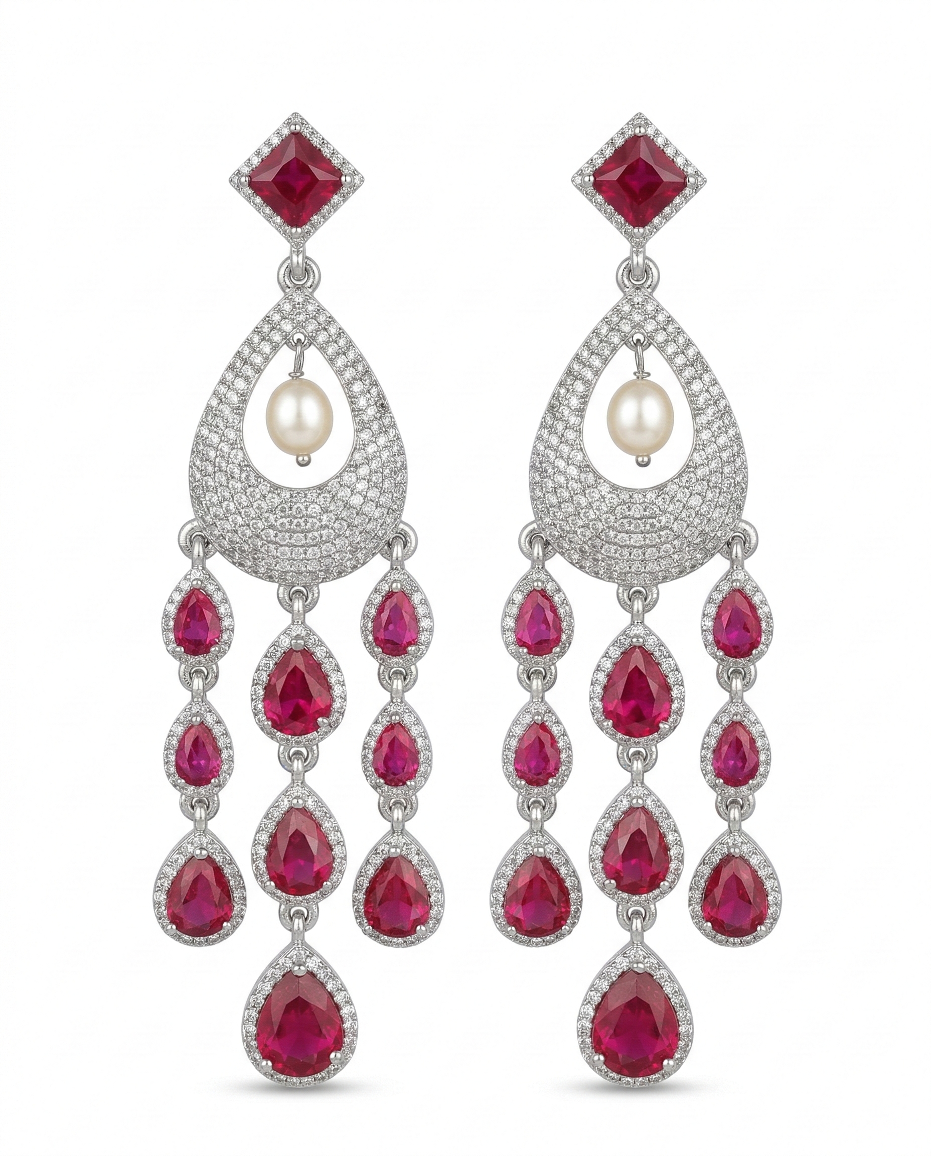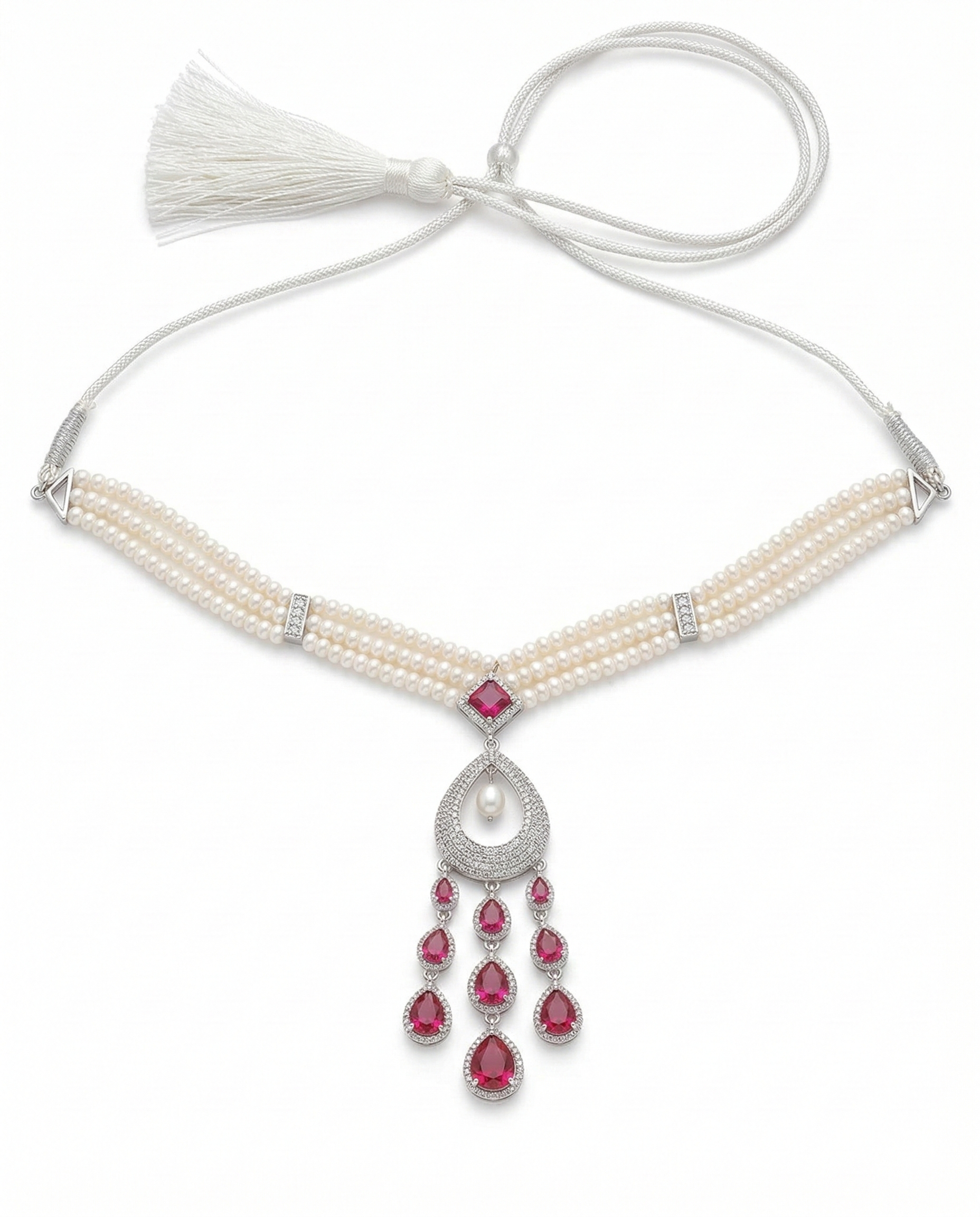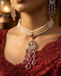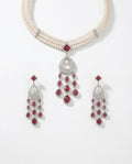Exude regal charm with this masterpiece of jewellery design. This set features a luxurious triple-strand necklace of lustrous white pearls, held together by stone-encrusted spacers. The centrepiece is a magnificent rhodium-finished pendant, boasting a bold ruby-red stone at the top that flows into a delicate, diamond-like, encrusted teardrop frame. The ensemble is completed by matching long dangling earrings that mirror the pendant's intricate ruby-drop fringe.