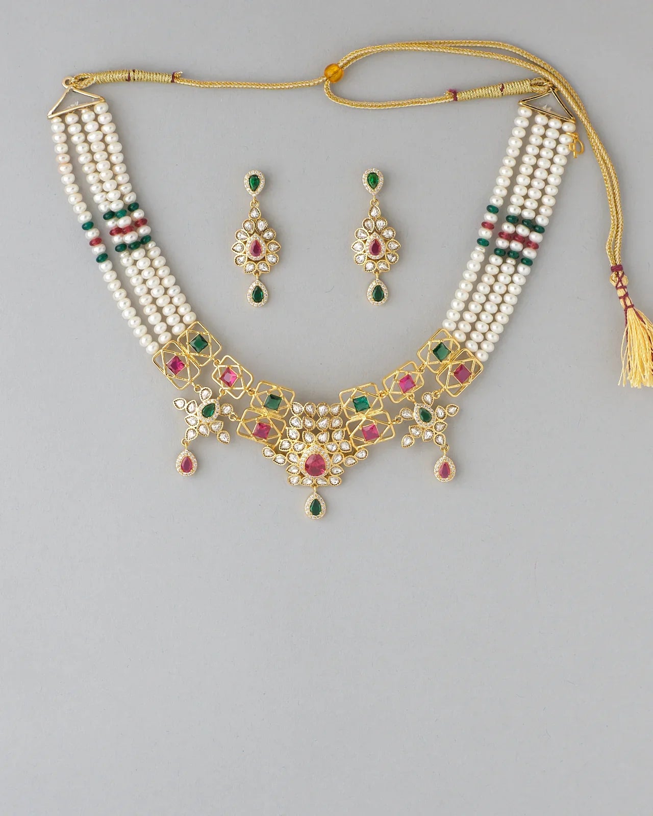 An exquisite necklace that combines twin strands of pearls with diamond-studded rhombus motifs in gold. The matching drop earrings complete the luxurious design. A perfect choice for bridal wear or grand occasions